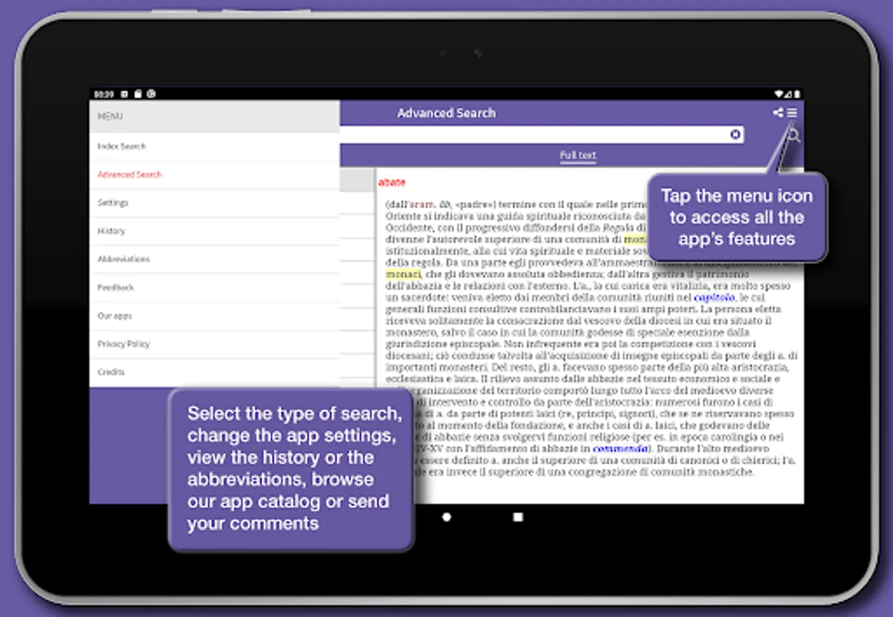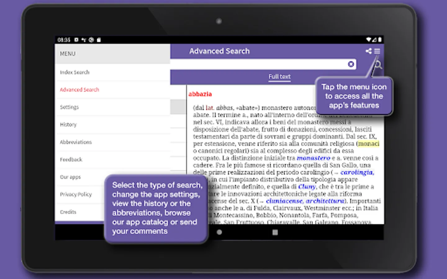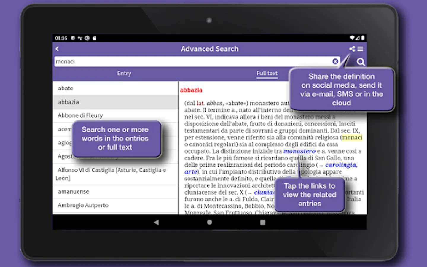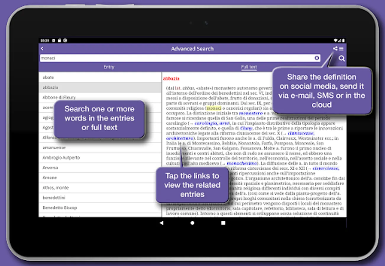 The app's interface has been redesigned to provide a simpler and more intuitive experience. Each definition can be shared using the features available in the device, such as social media, e-mail, SMS, cloud. A main menu that can be activated via an icon available at the top right of the screen enables all the features of the app:
