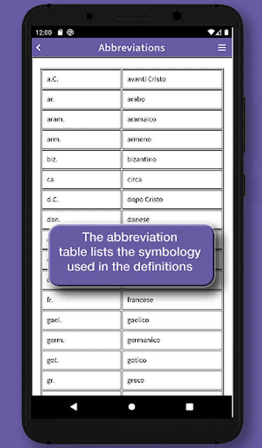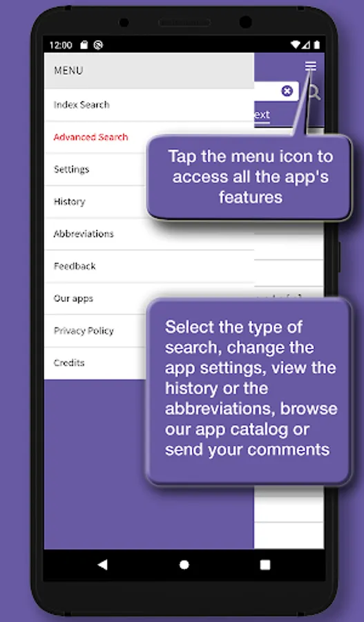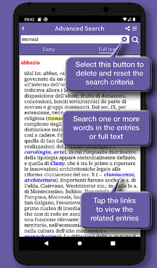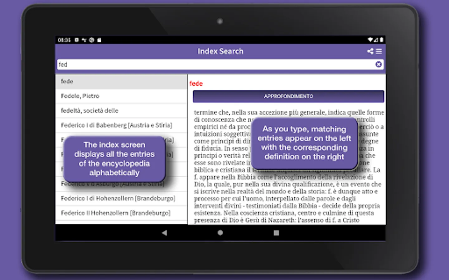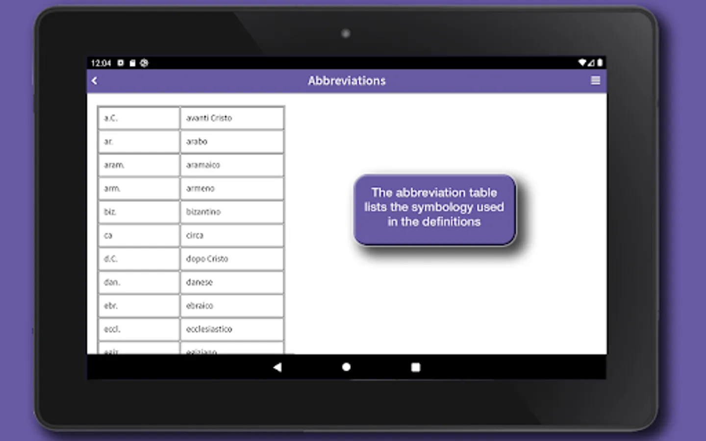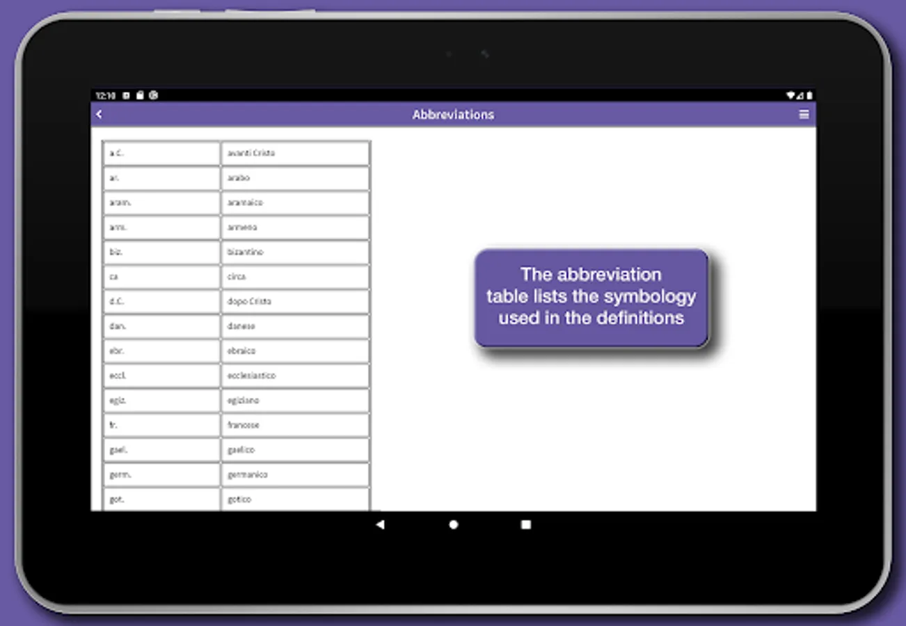 The app's interface has been redesigned to provide a simpler and more intuitive experience. Each definition can be shared using the features available in the device, such as social media, e-mail, SMS, cloud. A main menu that can be activated via an icon available at the top right of the screen enables all the features of the app: