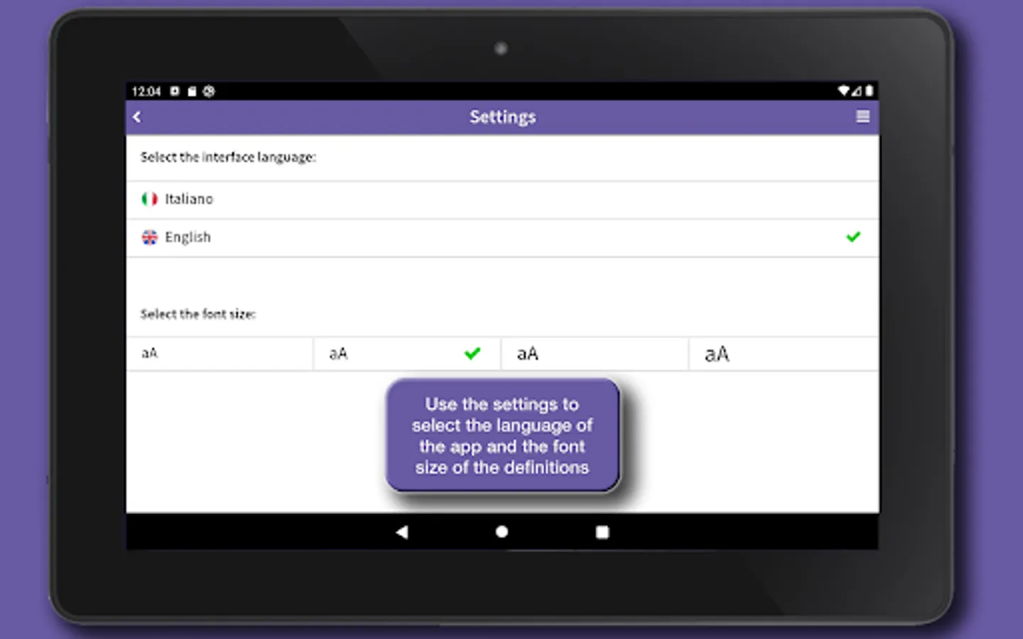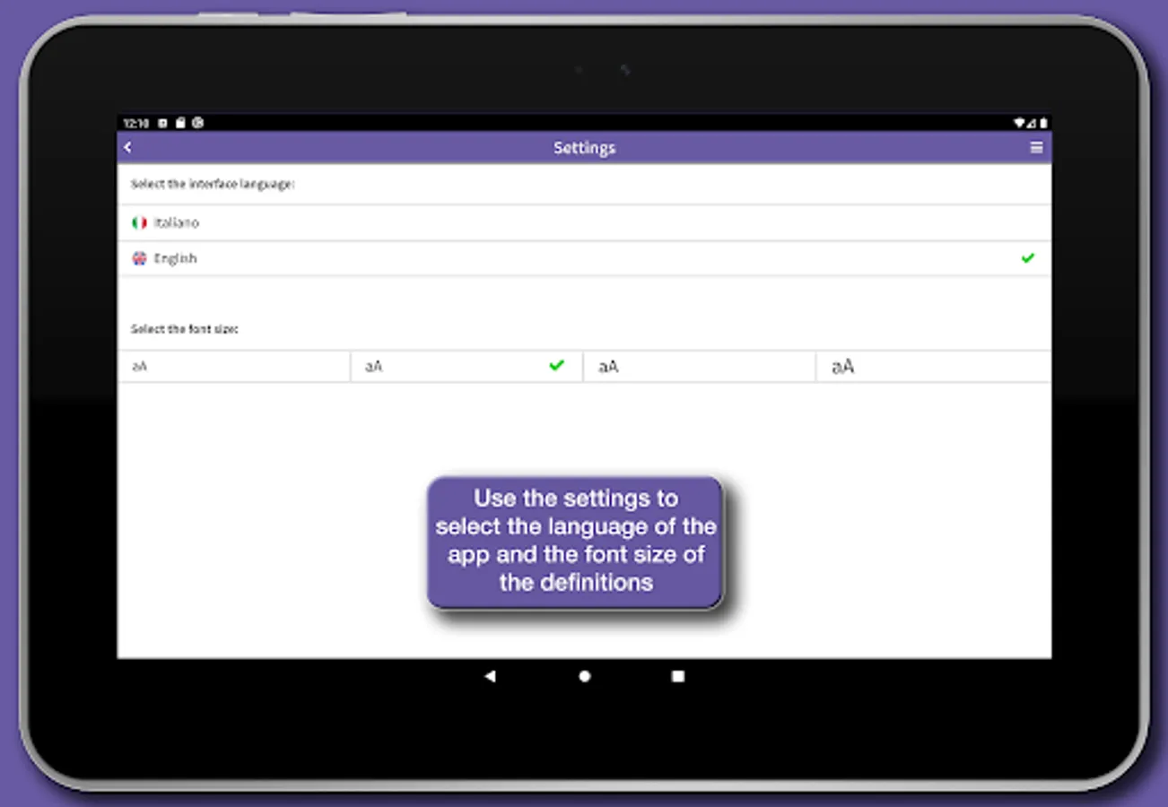 • Settings: allows you to choose the font size of the definitions and the language of the interface