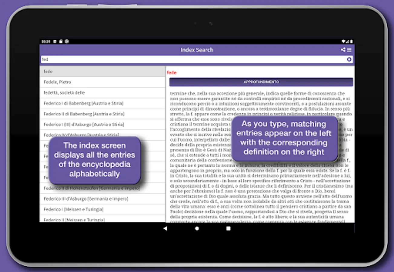 Spanning from Homer to Dan Brown, the app “le Garzantine – Medioevo” offers a comprehensive reference of 1000 years of history and civilization, from the end of the classic world up to the down of the Renaissance, that laid the foundations of modern Europe, are dissected by means of main figures, events, and institutions. From Charlemagne to Frederick Barbarossa, from Benedict of Norcia to Francis of Assisi, from Giotto to Simone Martini, from Boccaccio to François Villon, from Abelard to Occam, from paladin Orlando to Tristan and Iseult, this alphabetical and interdisciplinary reference brings you to discover one of the most complex and fascinating historical period: society, culture, tradition, imagination.