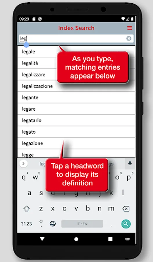 • Index search: displays in alphabetical order the headwords that match the characters typed in the search box
