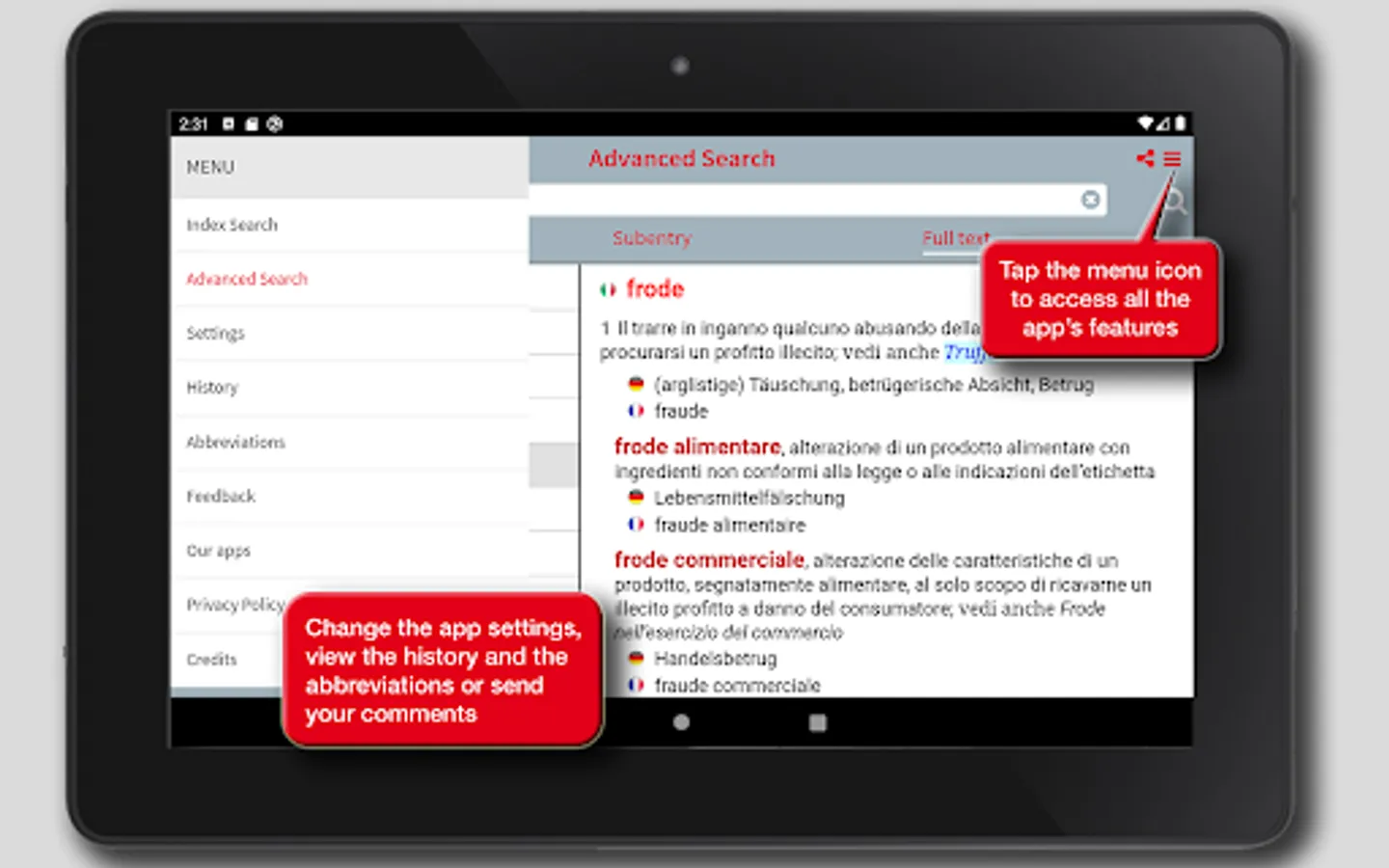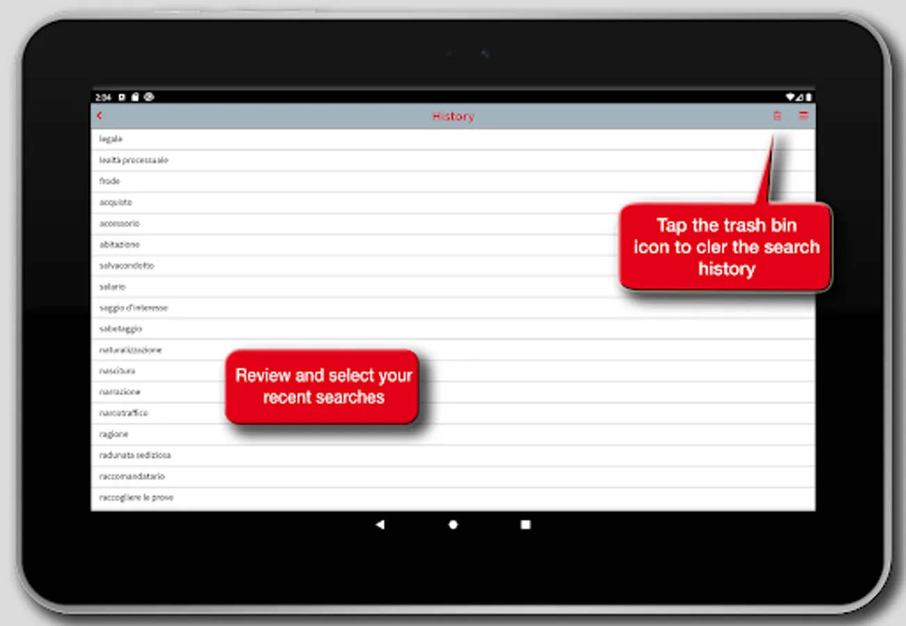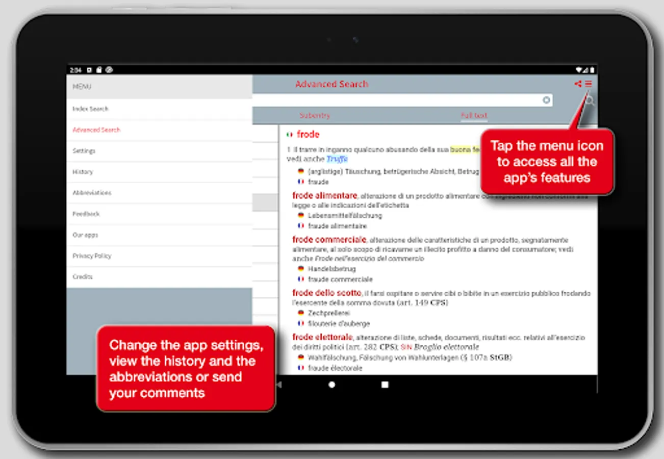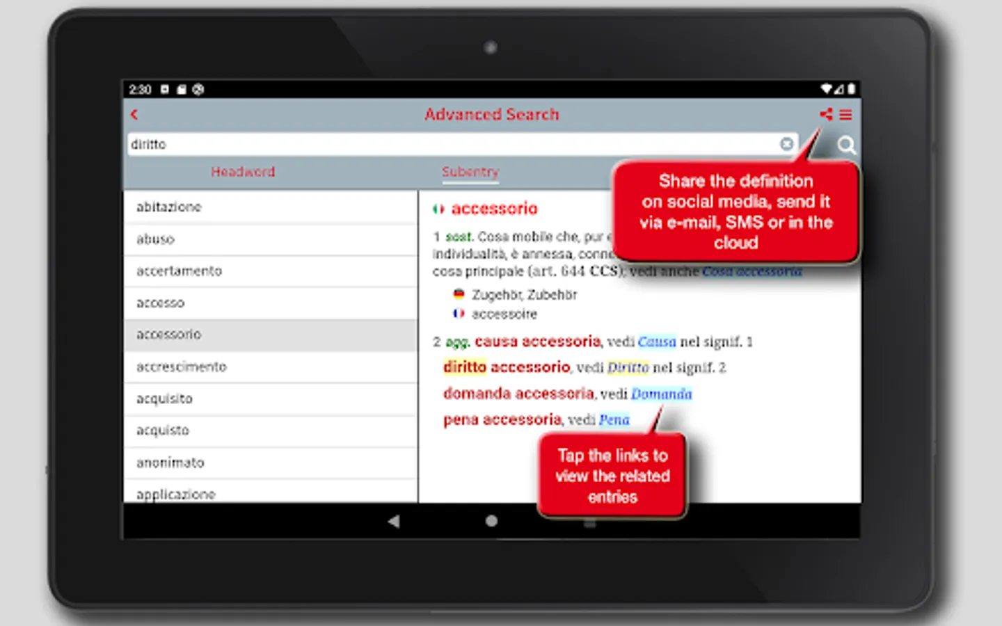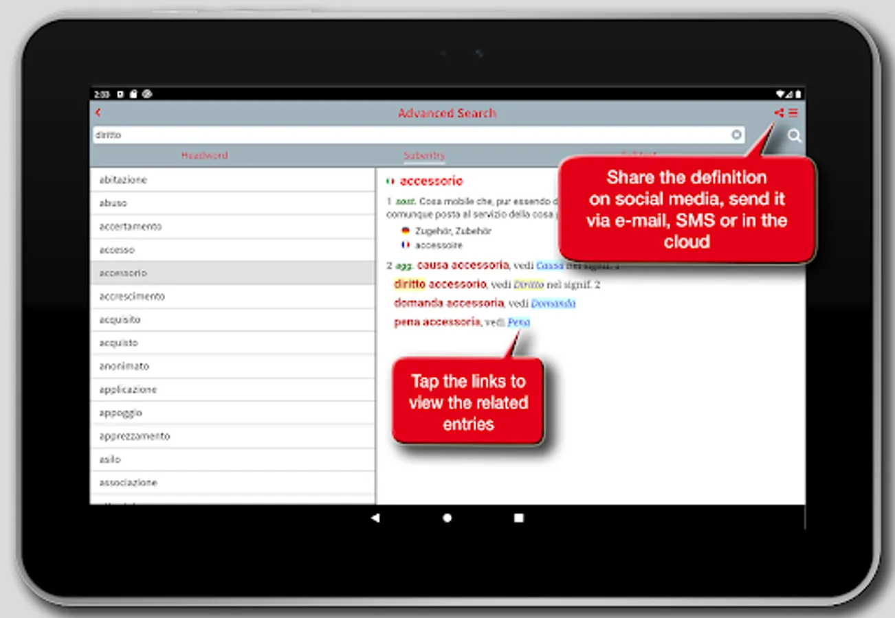 The app's interface has been redesigned to provide a simpler and more intuitive experience. Each definition can be shared using the features available in the device, such as social media, e-mail, SMS, cloud. A main menu that can be activated via an icon available at the top right of the screen enables all the features of the app: