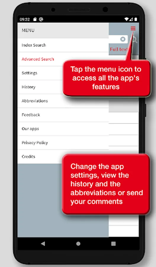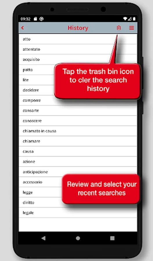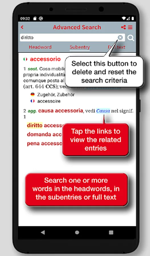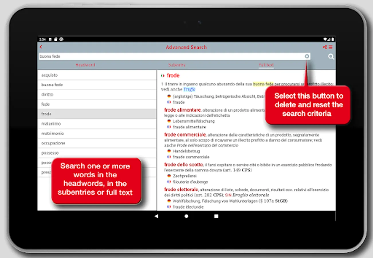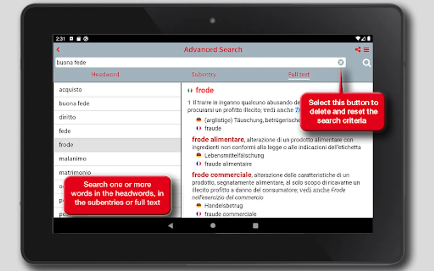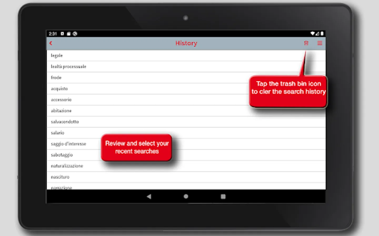 The app's interface has been redesigned to provide a simpler and more intuitive experience. Each definition can be shared using the features available in the device, such as social media, e-mail, SMS, cloud. A main menu that can be activated via an icon available at the top right of the screen enables all the features of the app:
