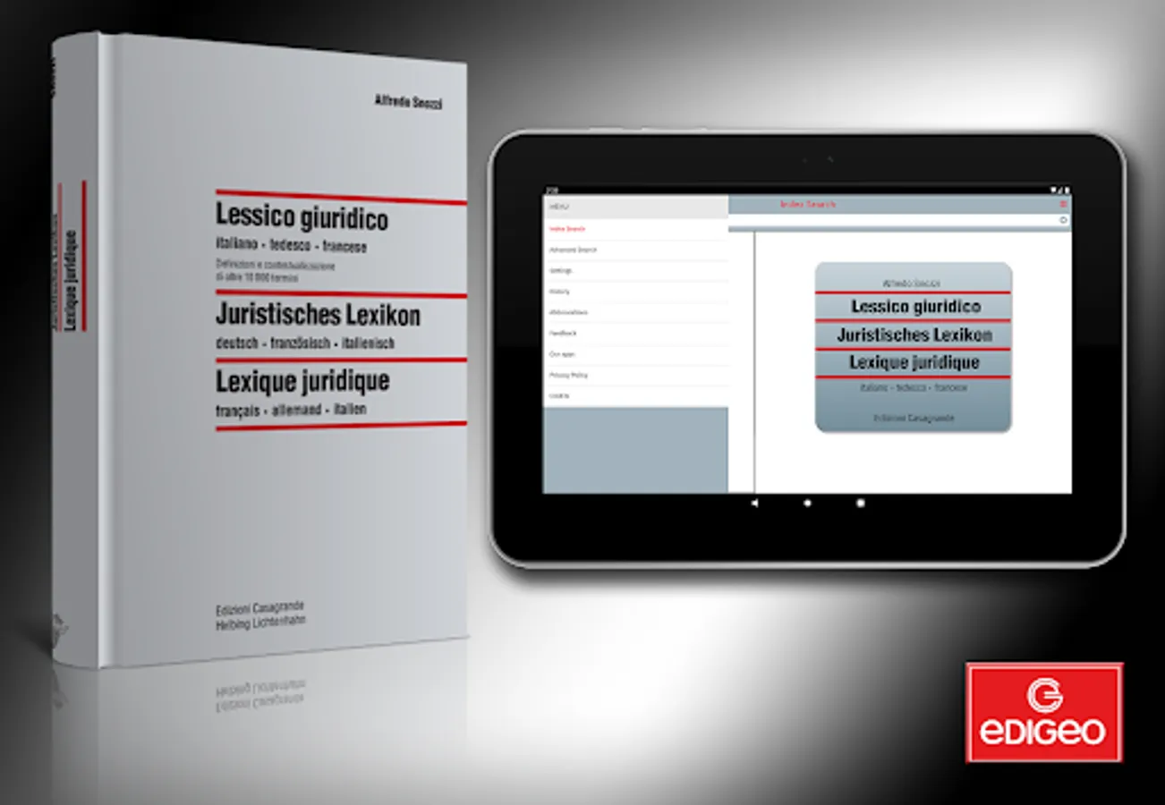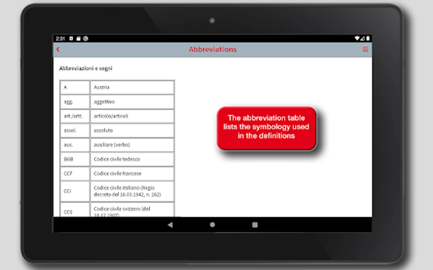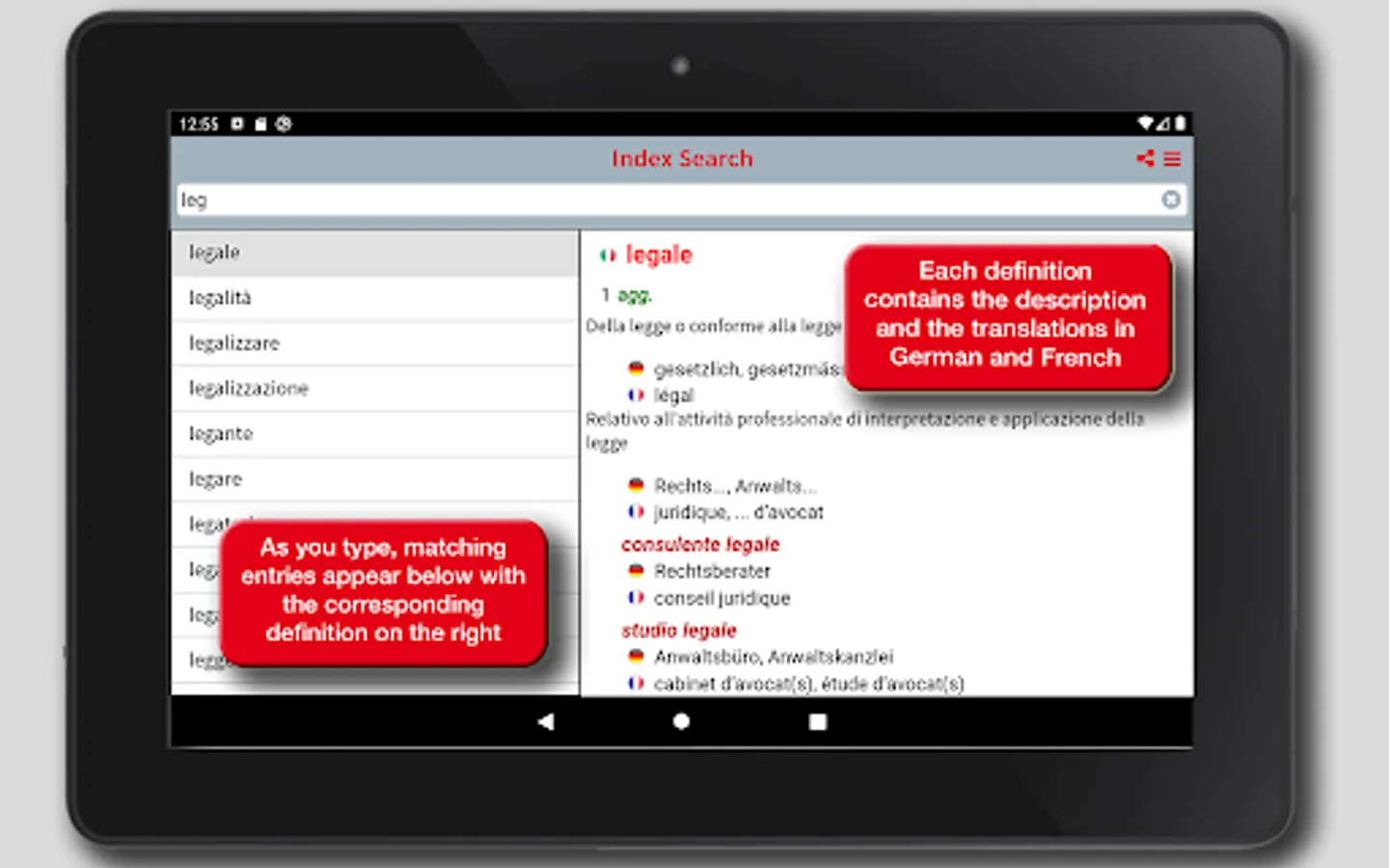 The app Legal Lexicon in 3 languages by Alfredo Snozzi is the first juridical trilingual dictionary (Italian-German-French), with more than 10.000 headwords and expressions taken from the juridical, political, and administrative language. Although pointed on the Italian and Swiss law systems, the data bank is full of links to legislations and juridical terminology of other European countries, mainly France and Germany. Because of its structure and content, it differs from traditional bilingual dictionaries as not only it is trilingual, but it also defines and contextualizes the individual headwords, indicating any different meanings..