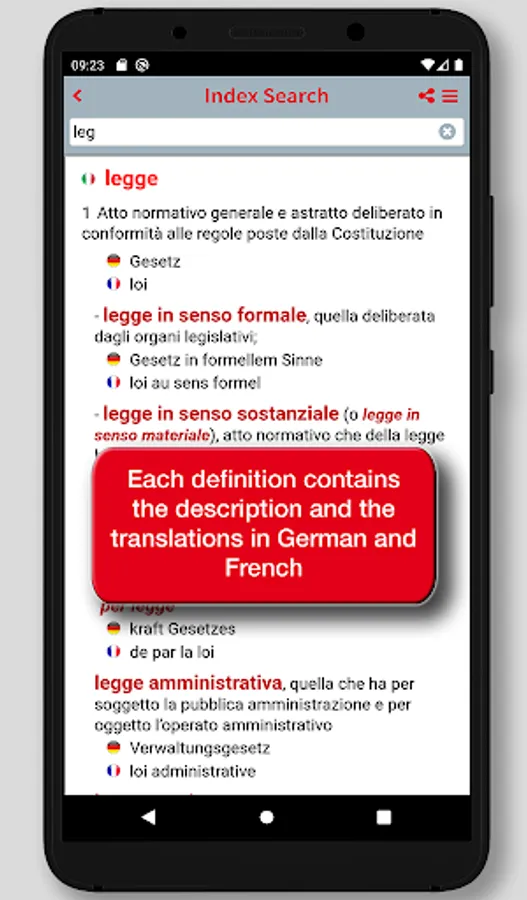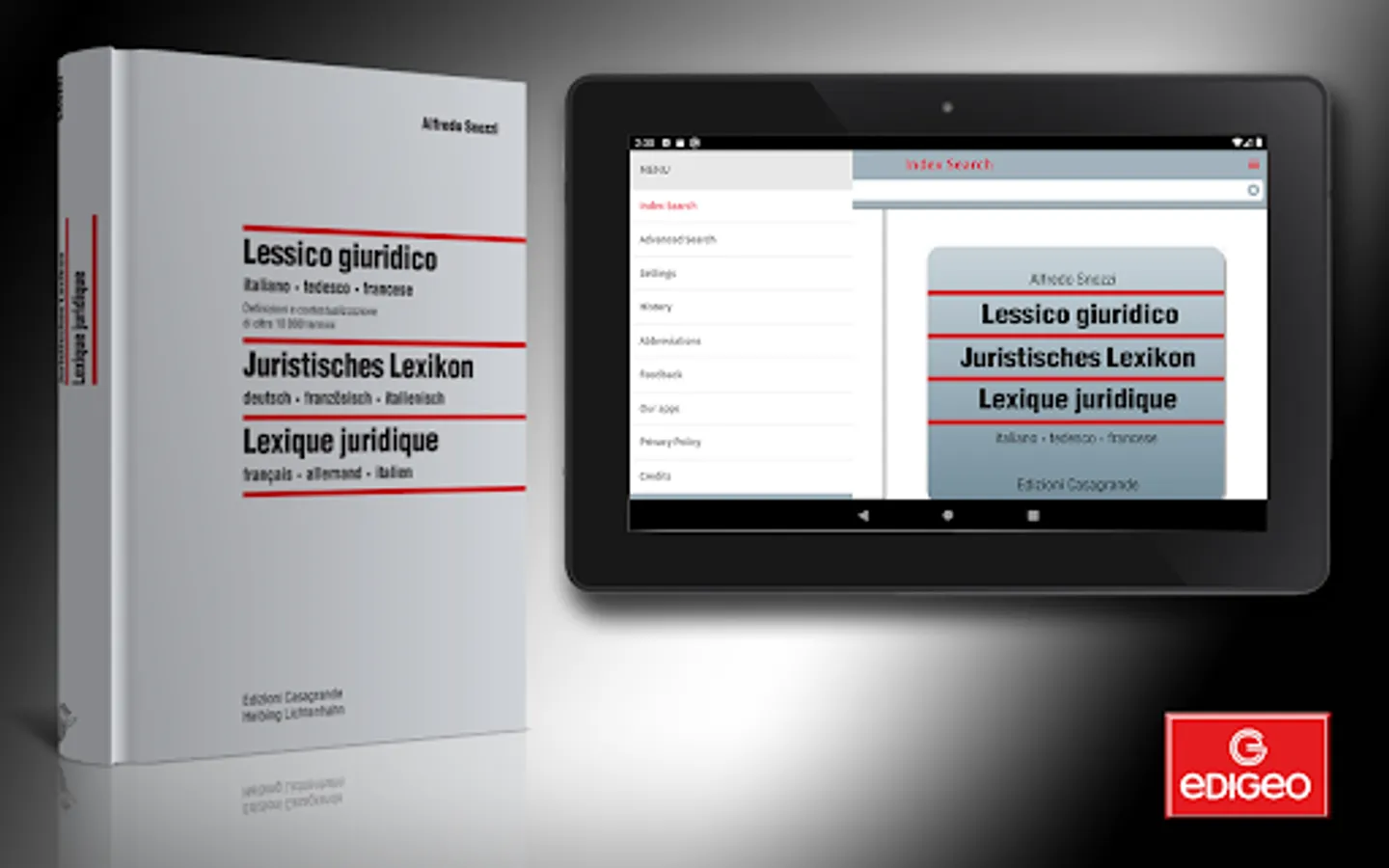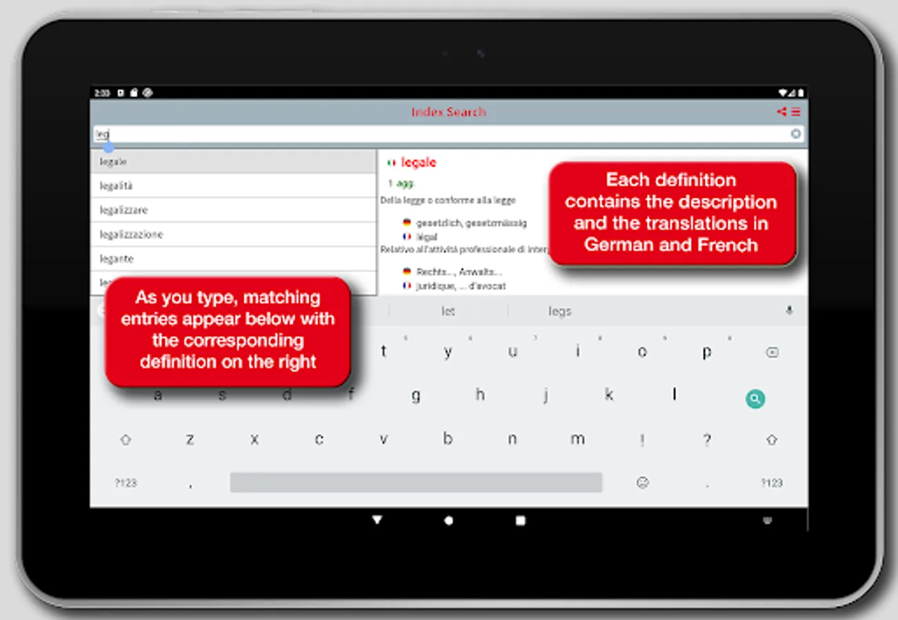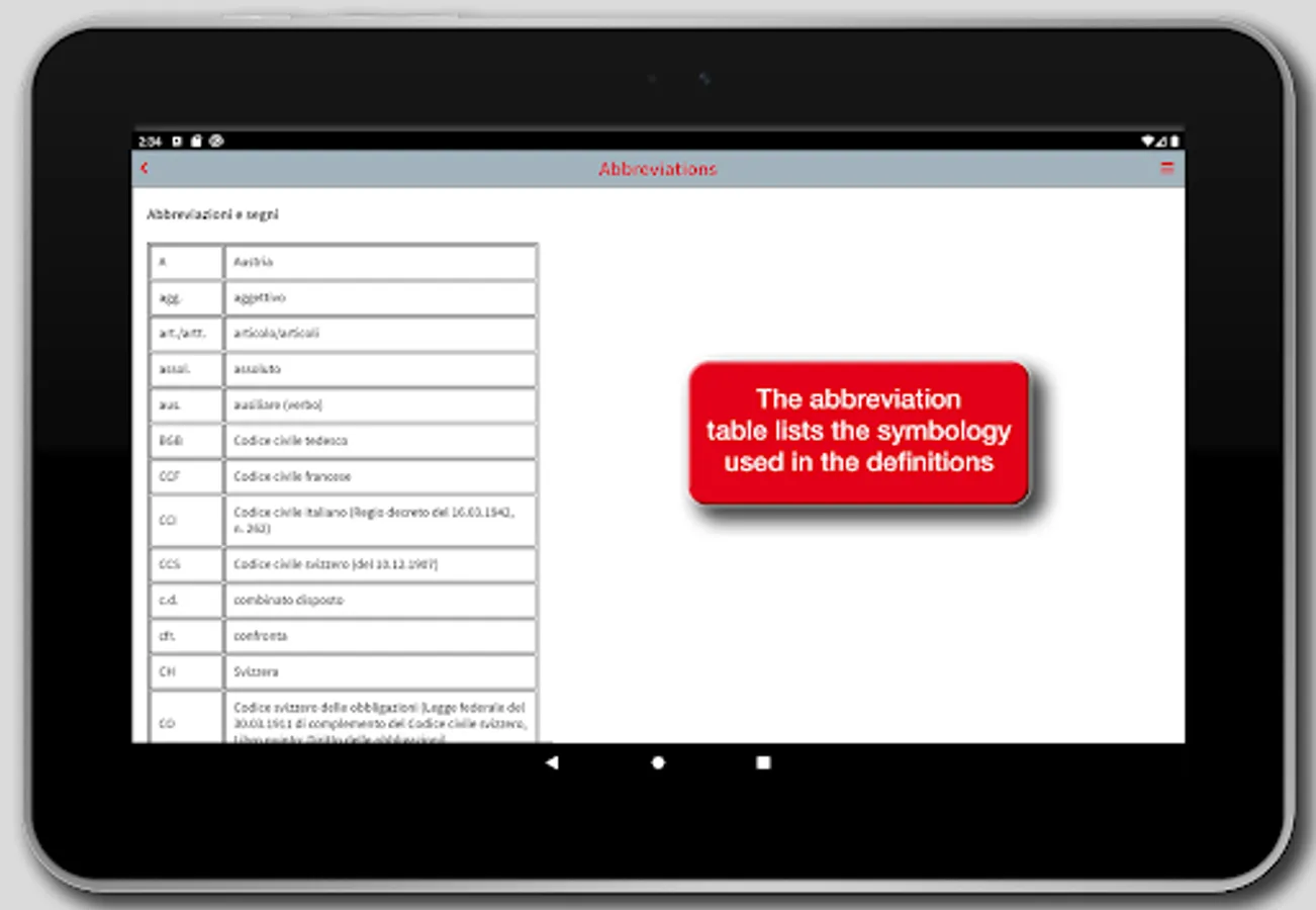 The app Legal Lexicon in 3 languages by Alfredo Snozzi is the first juridical trilingual dictionary (Italian-German-French), with more than 10.000 headwords and expressions taken from the juridical, political, and administrative language. Although pointed on the Italian and Swiss law systems, the data bank is full of links to legislations and juridical terminology of other European countries, mainly France and Germany. Because of its structure and content, it differs from traditional bilingual dictionaries as not only it is trilingual, but it also defines and contextualizes the individual headwords, indicating any different meanings..