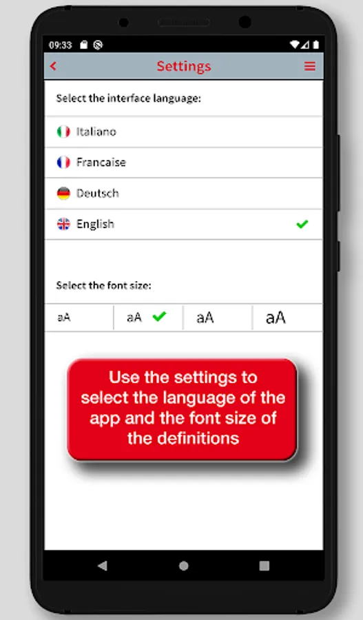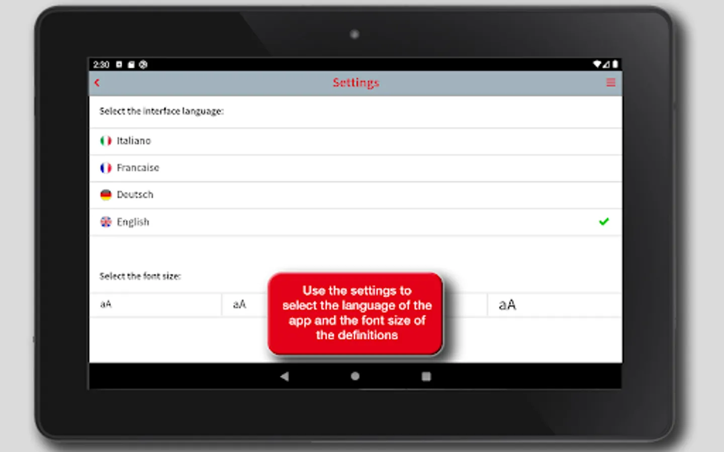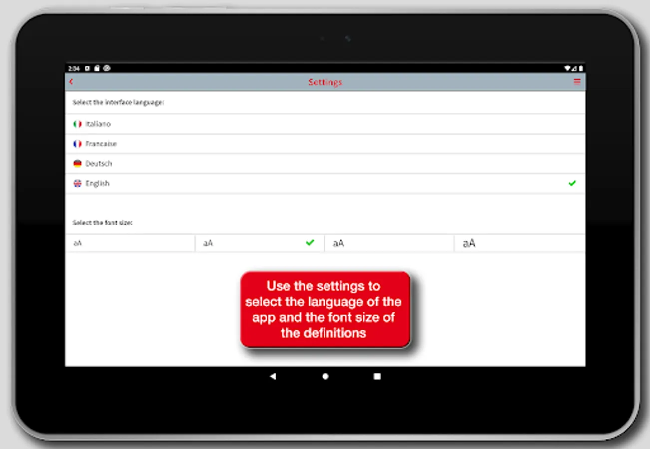 • Settings: allows you to choose the font size of the definitions and the language of the interface