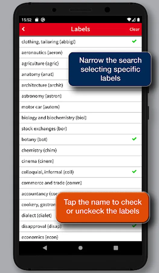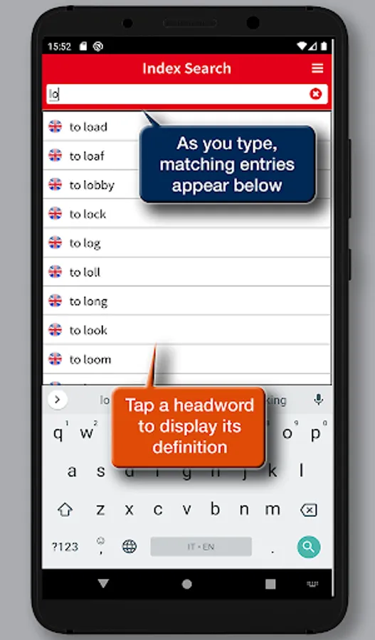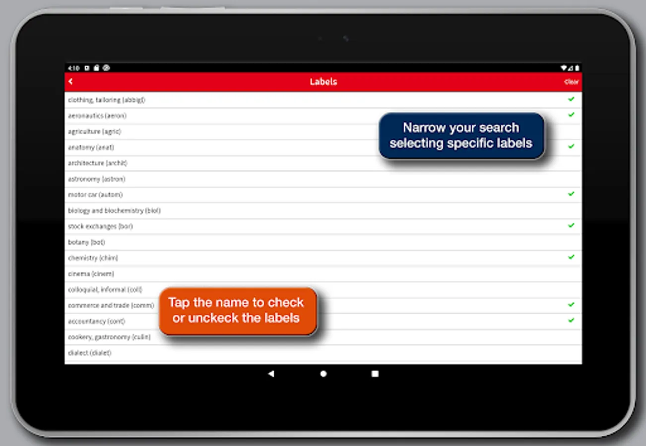 In addition to the index, where it is possible to automatically find the entries matching the characters you type, the app allows you to search for specific phrasal verbs. The Glossary option allows you to search for Italian verbs translated through an English phrasal verb, while the Full Text option allows you to search for Italian and English terms within all dictionary entries. To narrow the search scope, the Categories option lets you select specific categories (for example, anatomy, botany, policy, etc.).