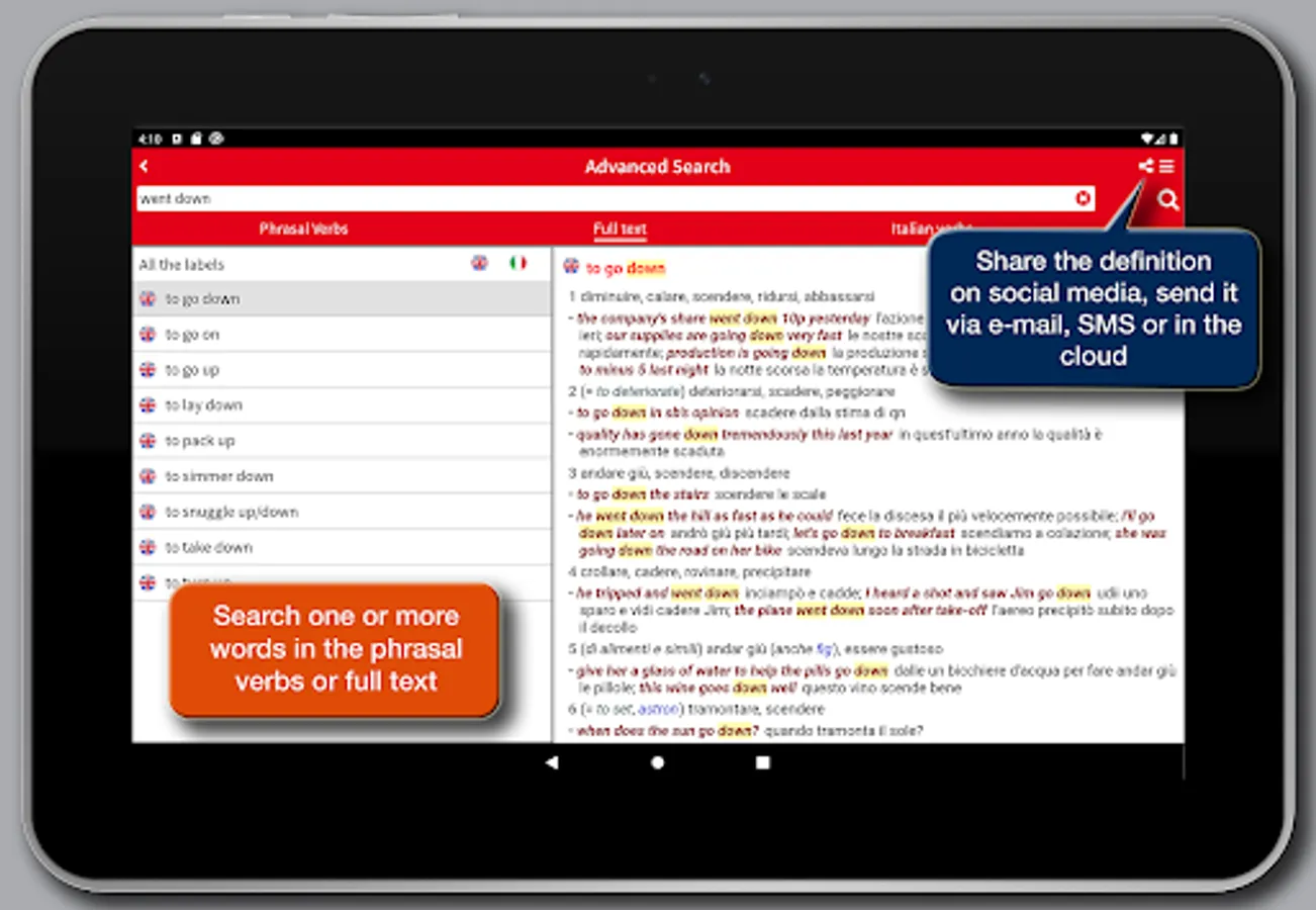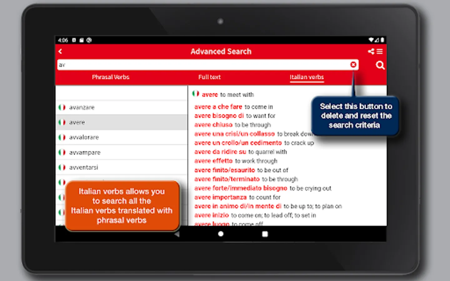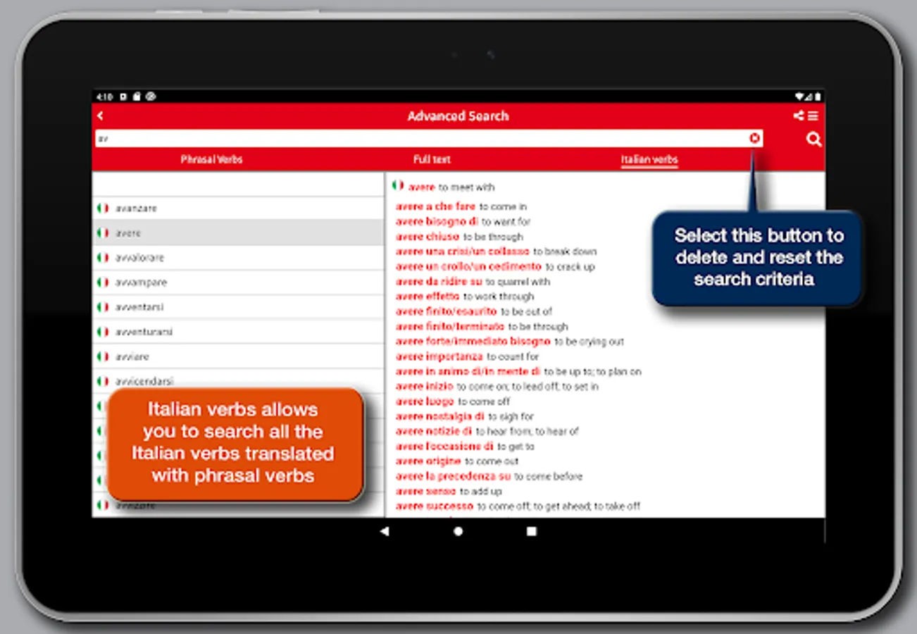 • Advanced search: lets you search for verbs, in full text, and in the index of Italian verbs translated with phrasal verbs