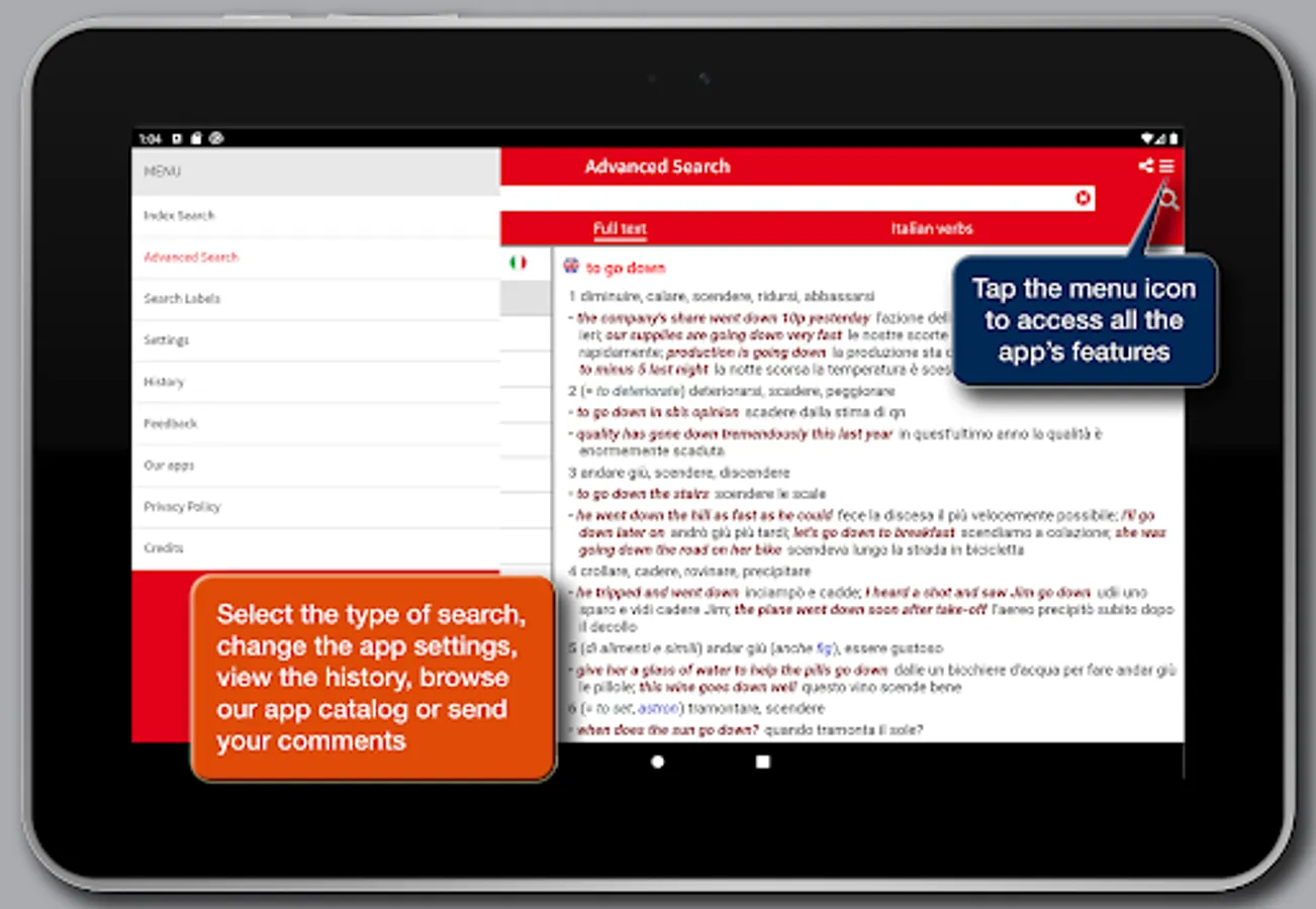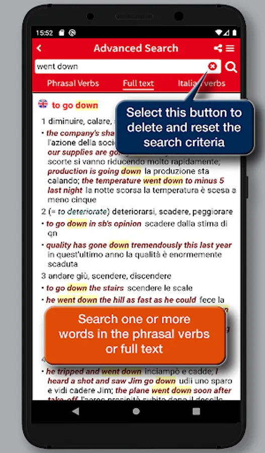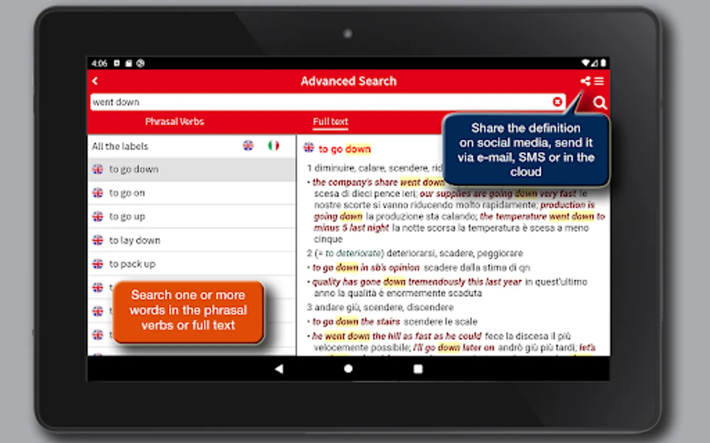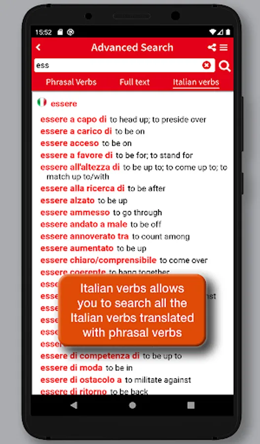 • Advanced search: lets you search for verbs, in full text, and in the index of Italian verbs translated with phrasal verbs