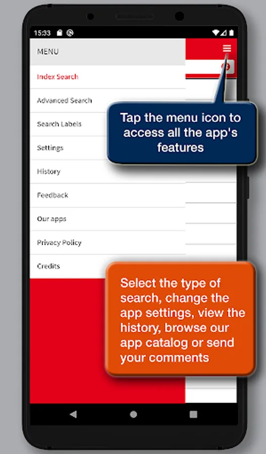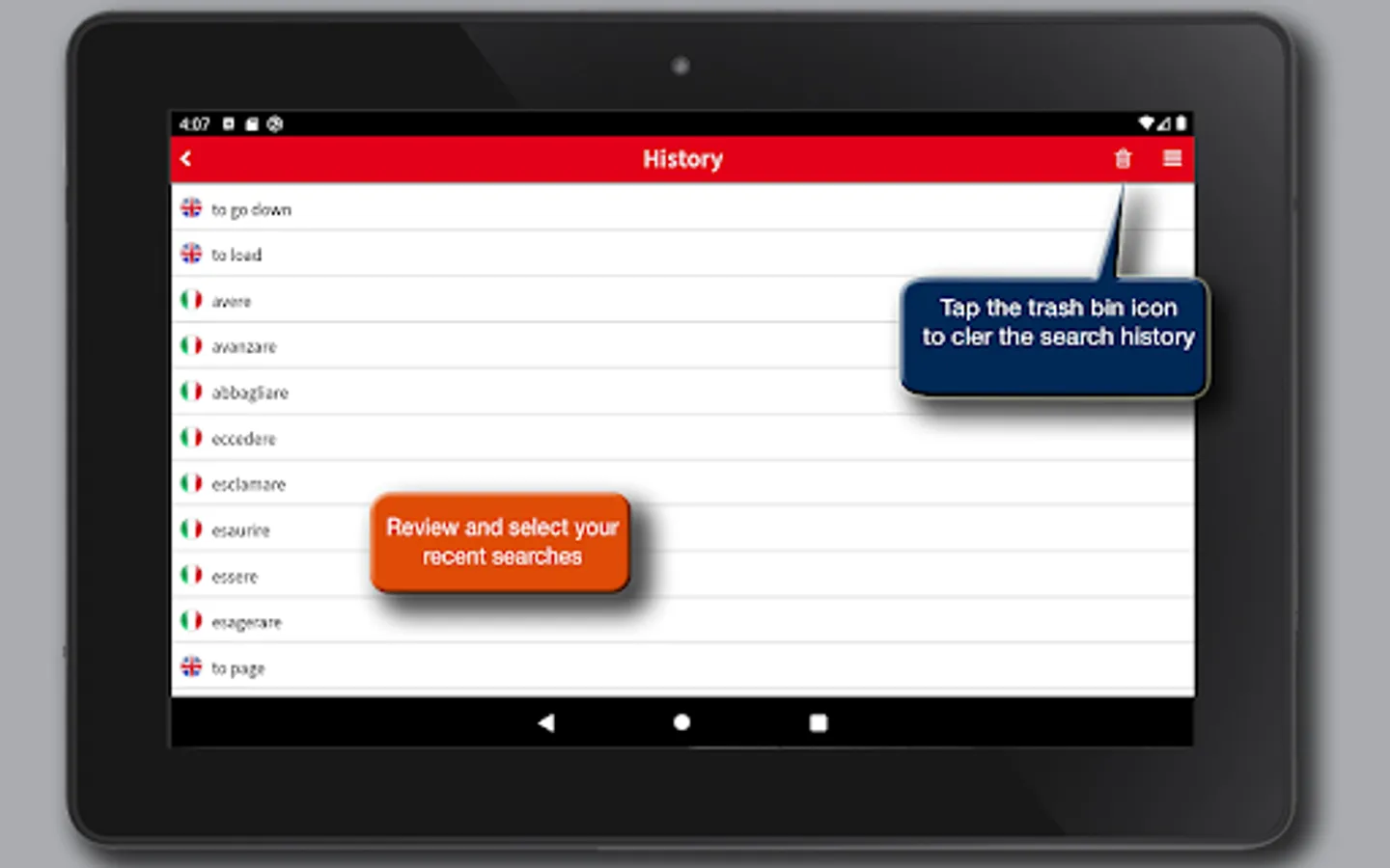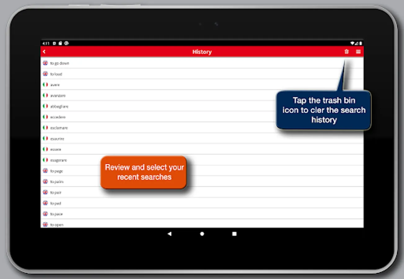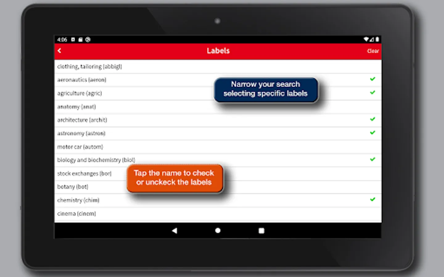 The app's interface has been redesigned to provide a simpler and more intuitive experience. Each definition can be shared using the features available in the device, such as social media, e-mail, SMS, cloud. A main menu that can be activated via an icon available at the top right of the screen enables all the features of the app: