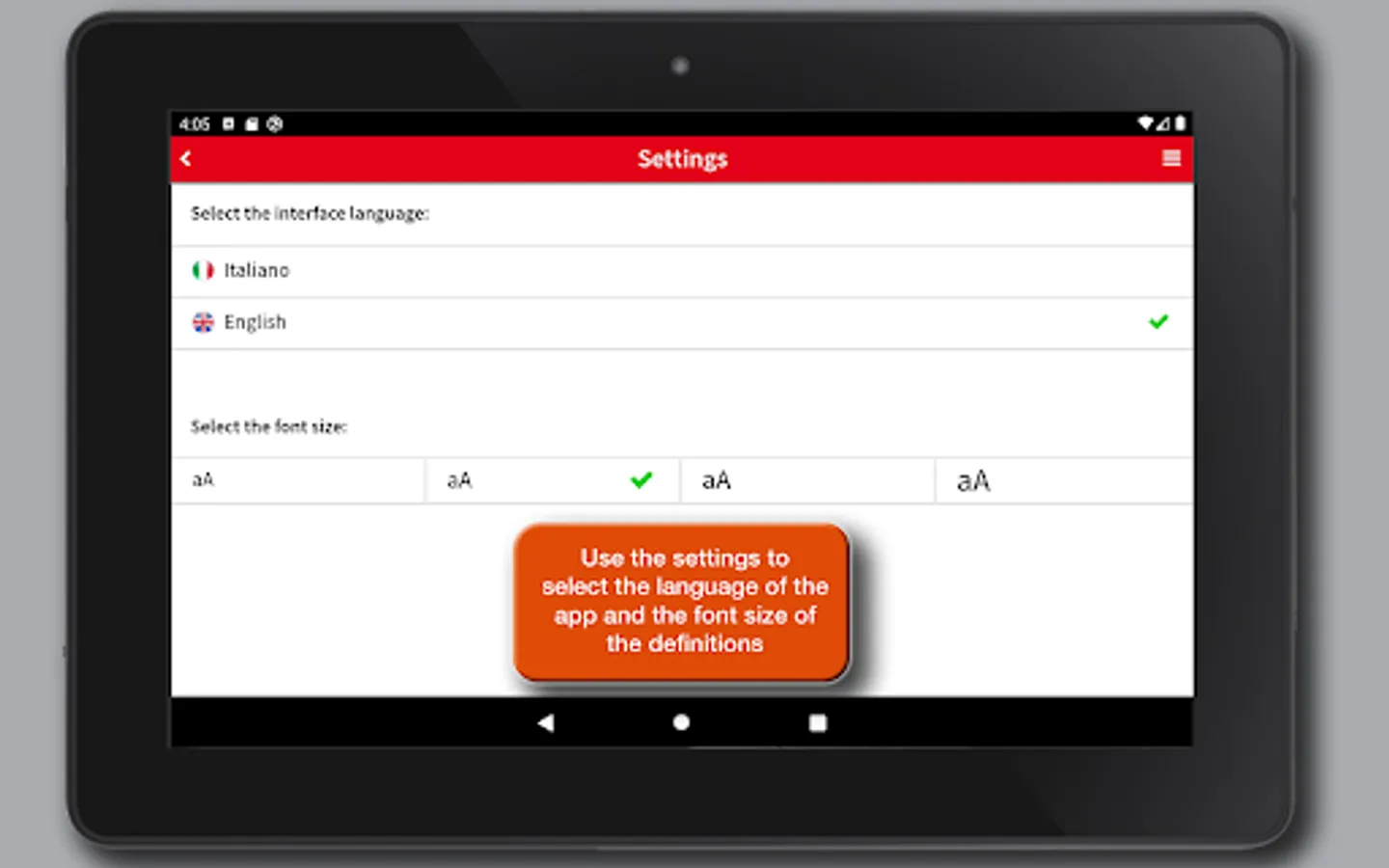 • Settings: allows you to choose the font size of the definitions and the language of the interface