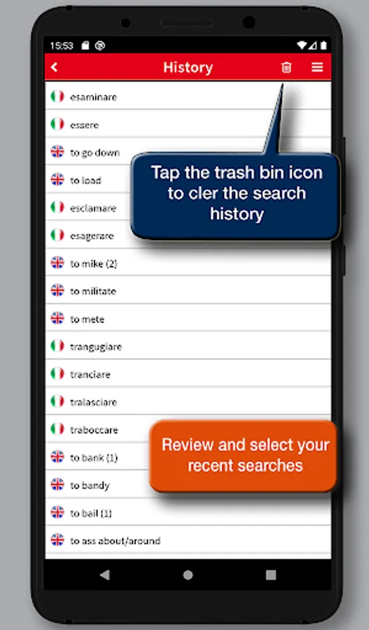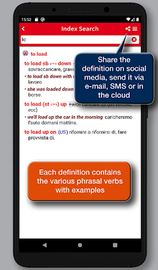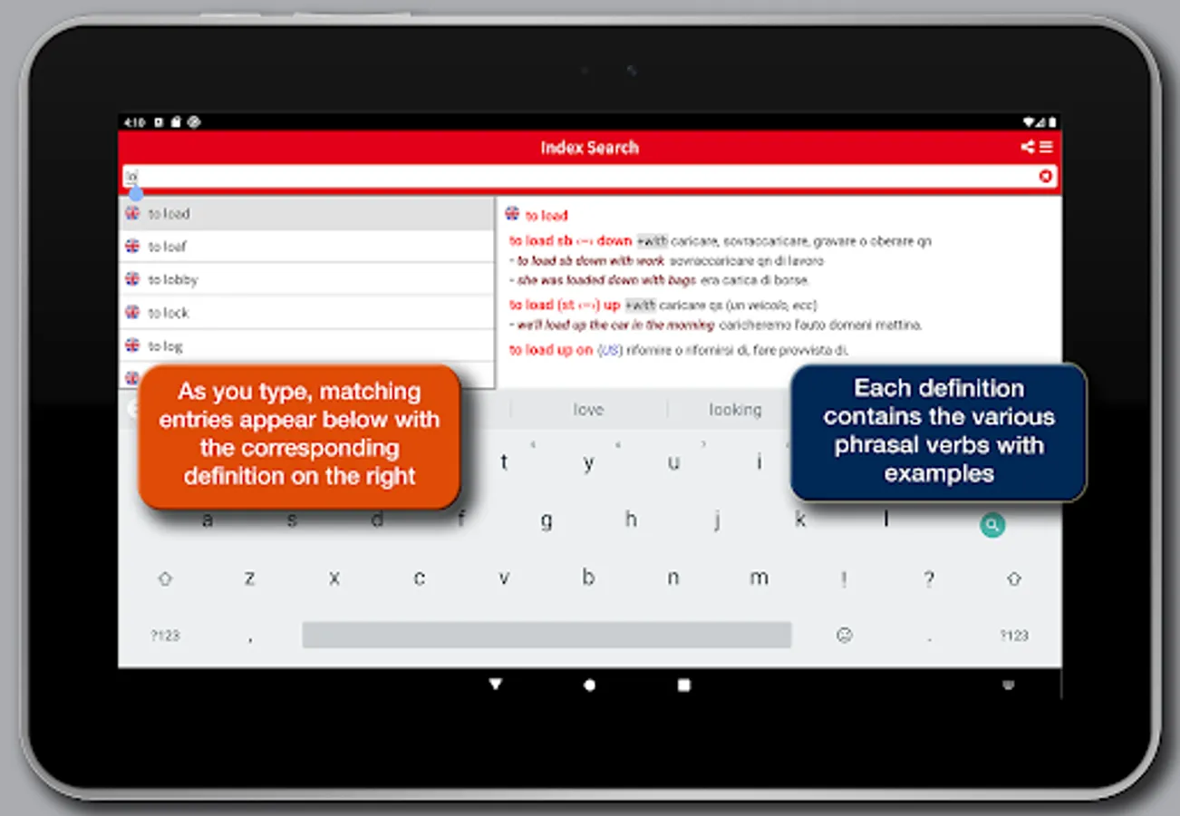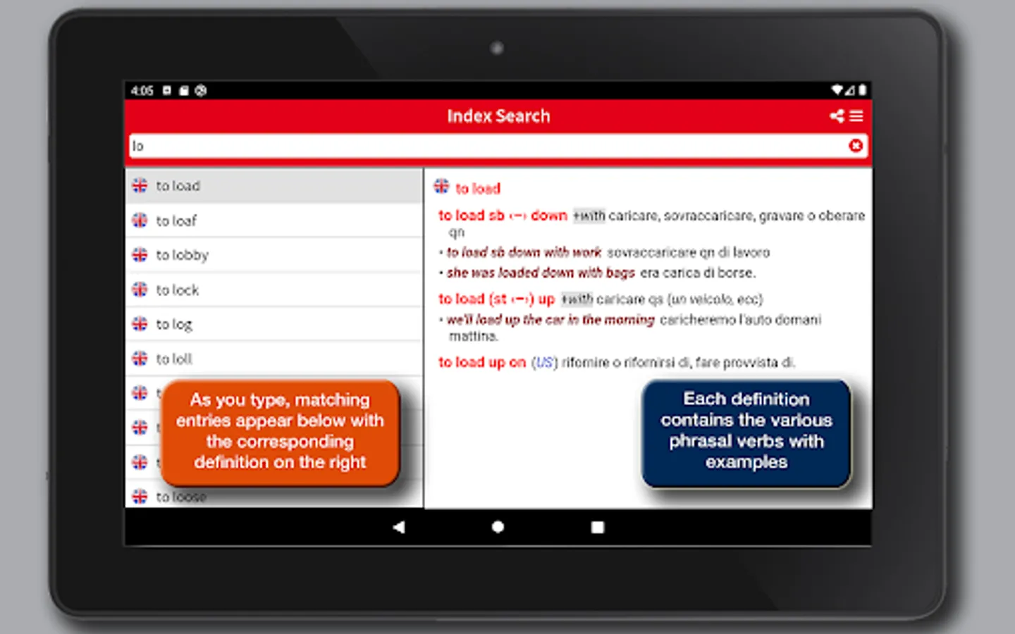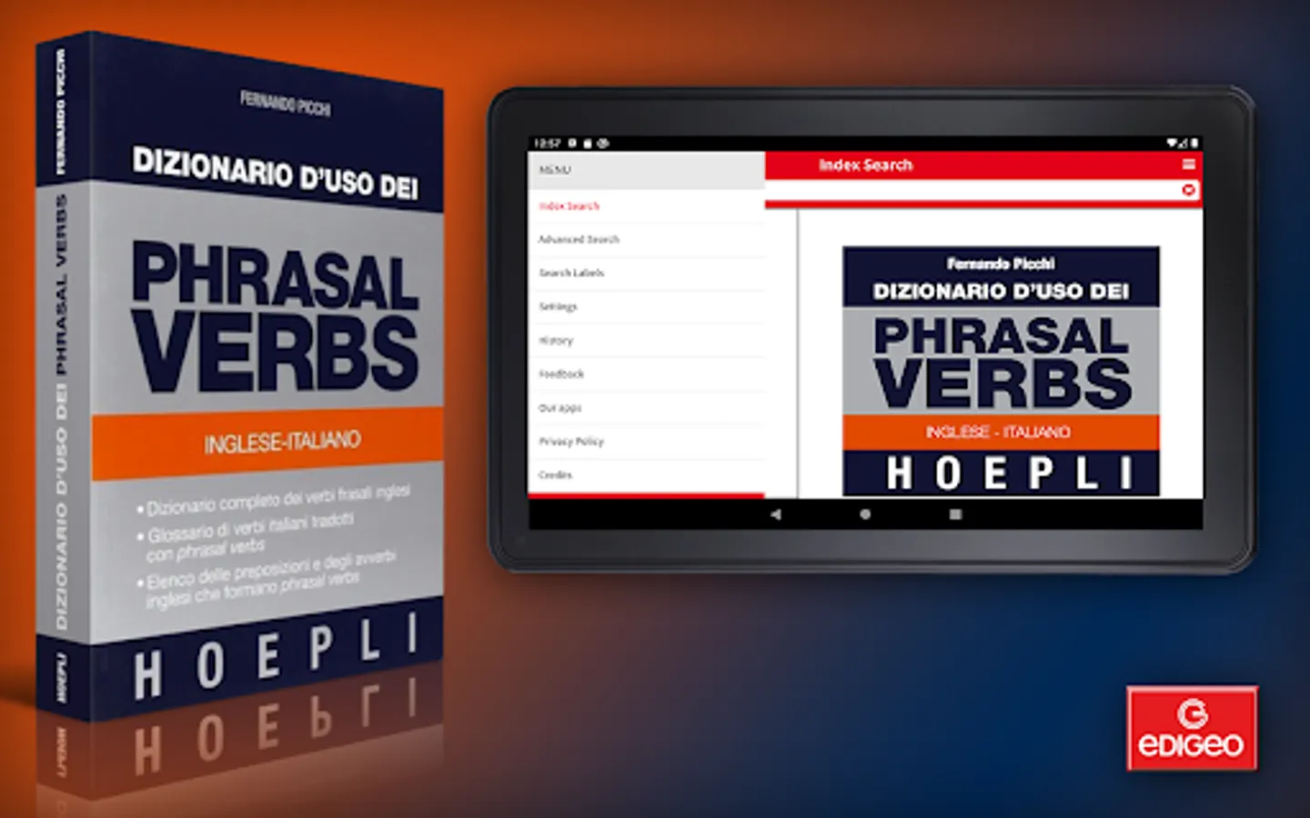 The app Hoepli Phrasal Verbs Dictionary by Fernando Picchi is a comprehensive guide to using and understanding English phrasal verbs. For each phrasal verb, various Italian translations are provided, which faithfully or extensively reproduce the meaning, further clarified by a wide range of examples, which also illustrate the use.