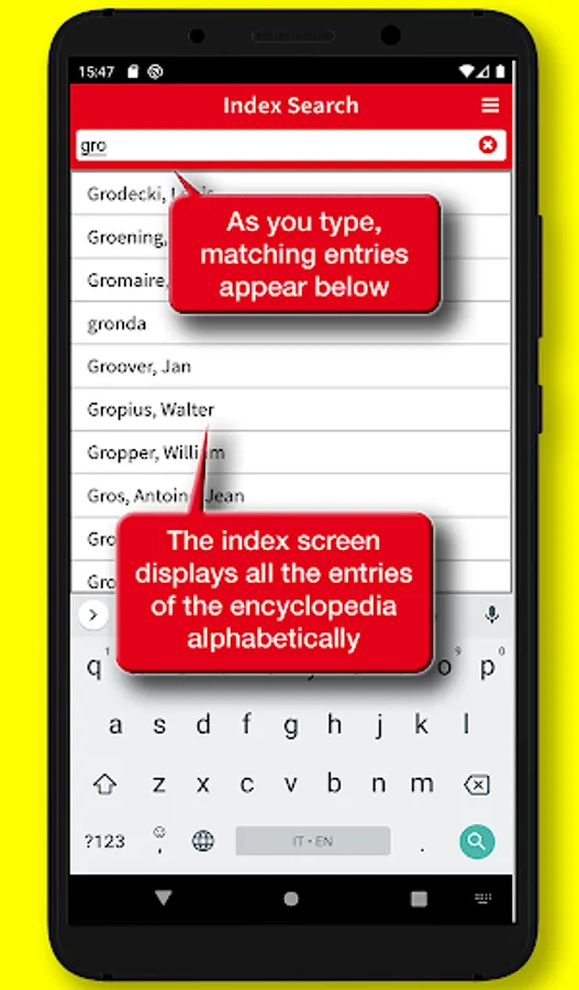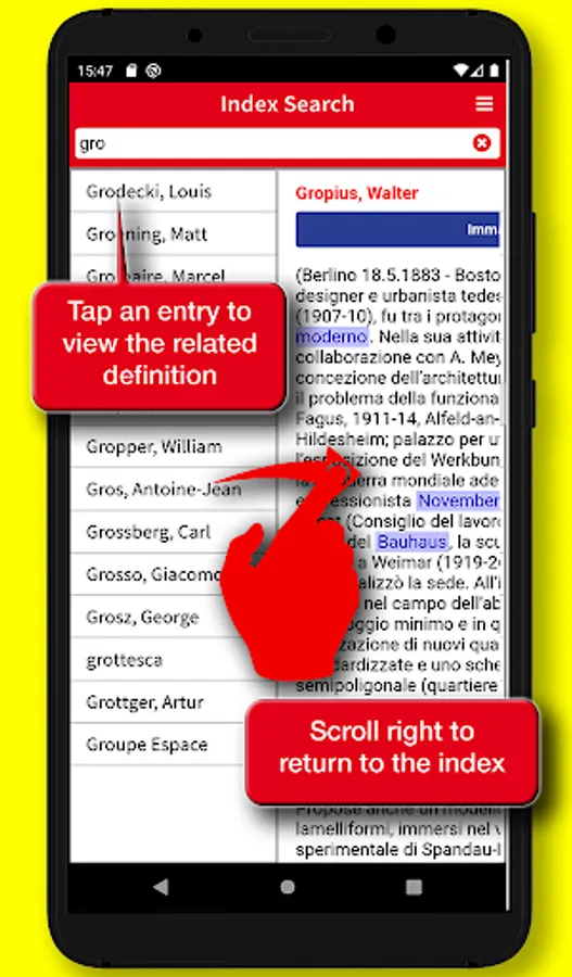 • Index search: displays in alphabetical order the headwords that match the characters typed in the search box
