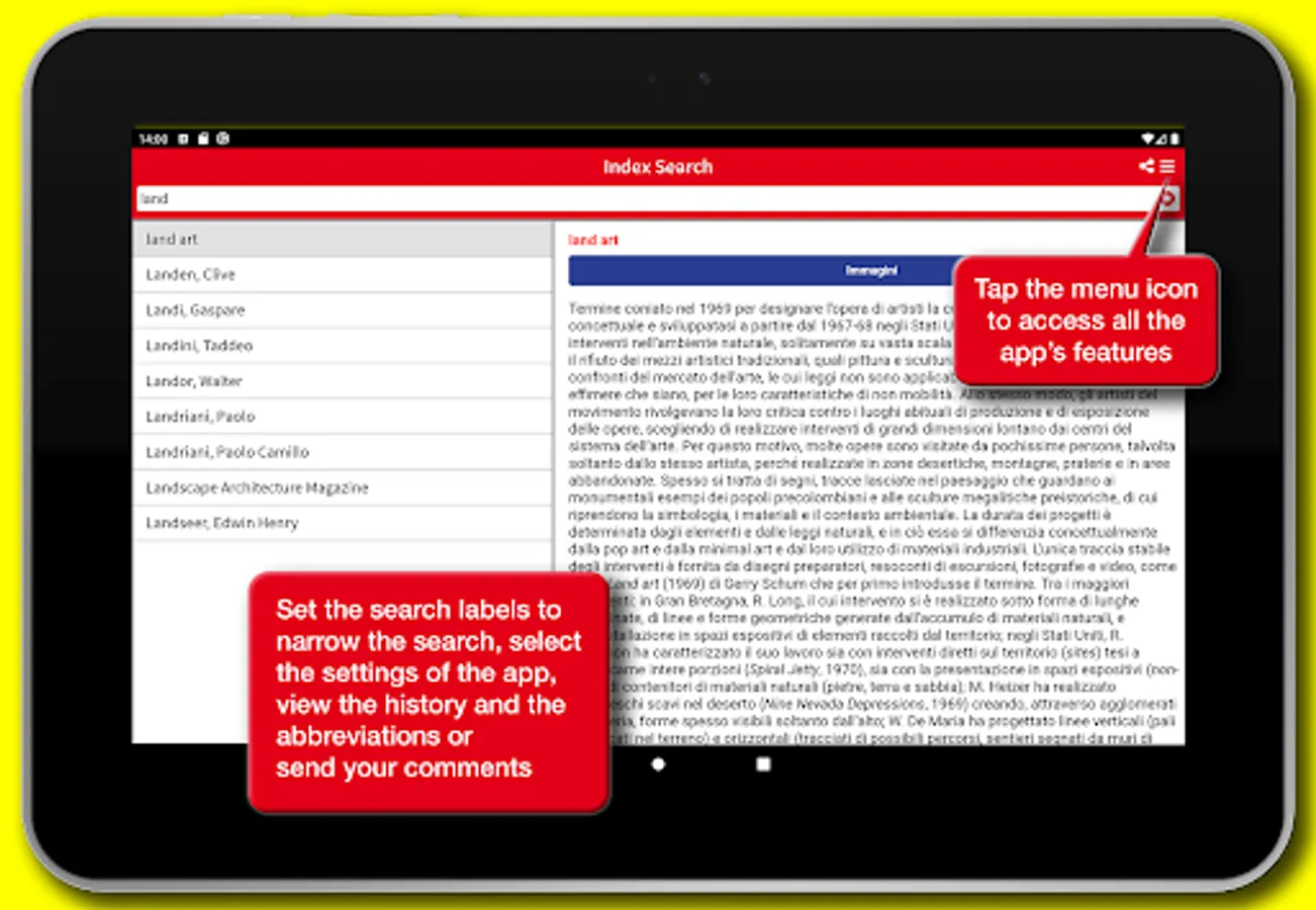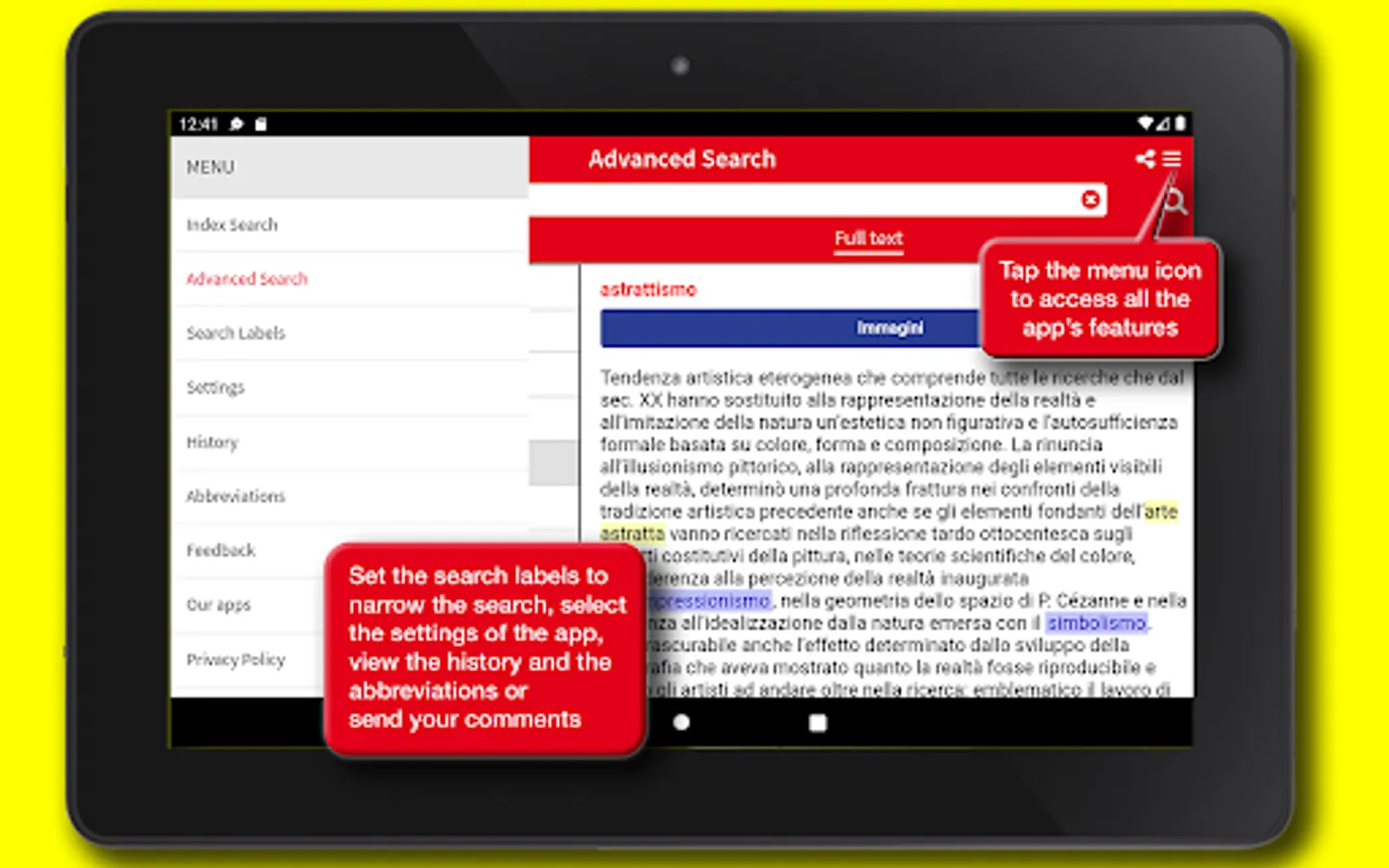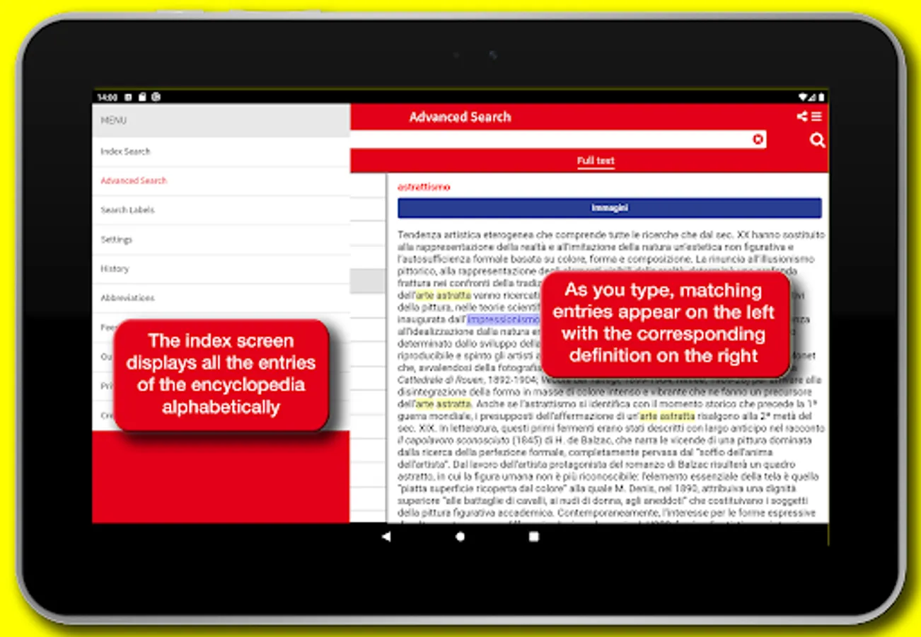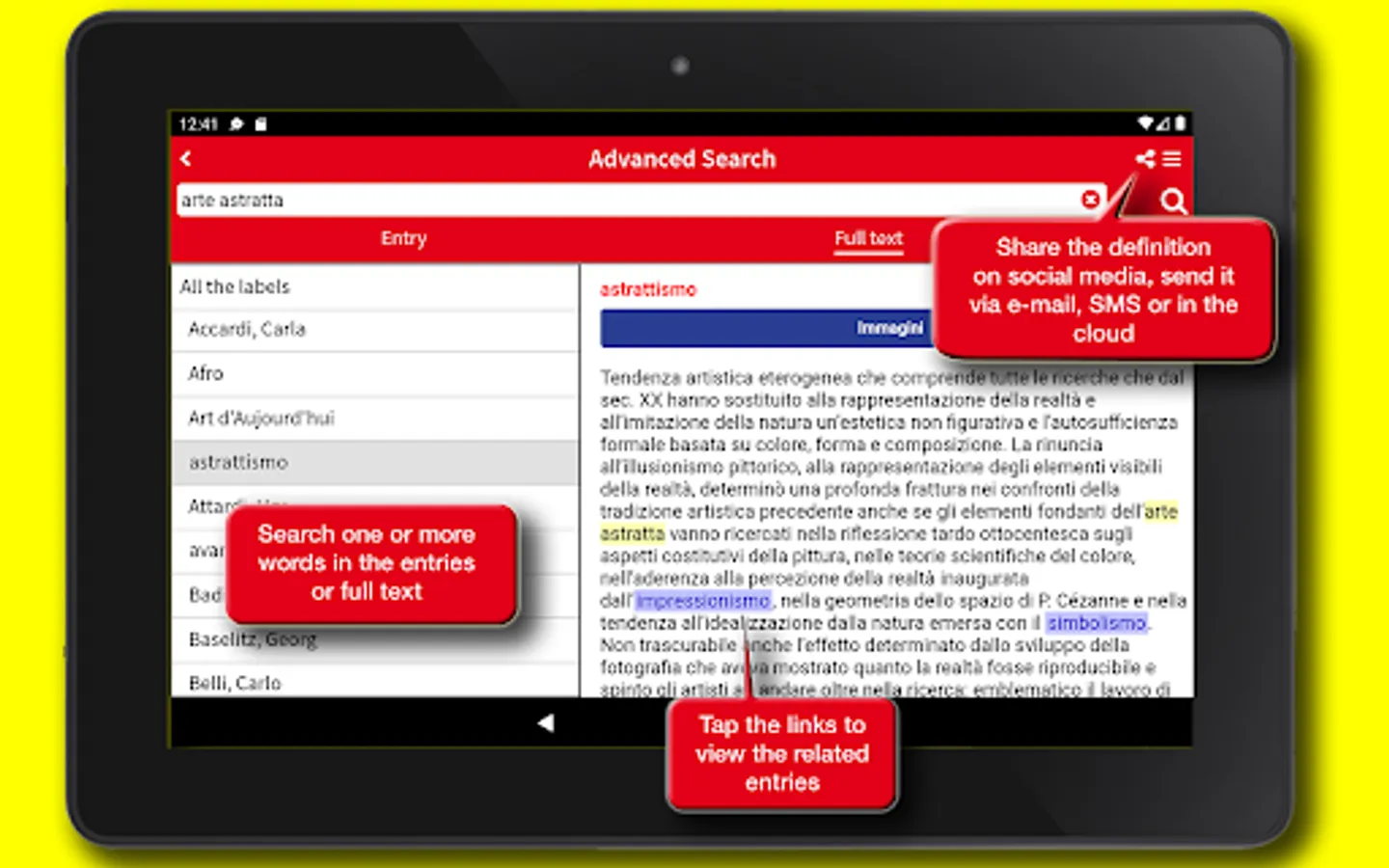The app's interface has been redesigned to provide a simpler and more intuitive experience. Each definition can be shared using the features available in the device, such as social media, e-mail, SMS, cloud. A main menu that can be activated via an icon available at the top right of the screen enables all the features of the app: