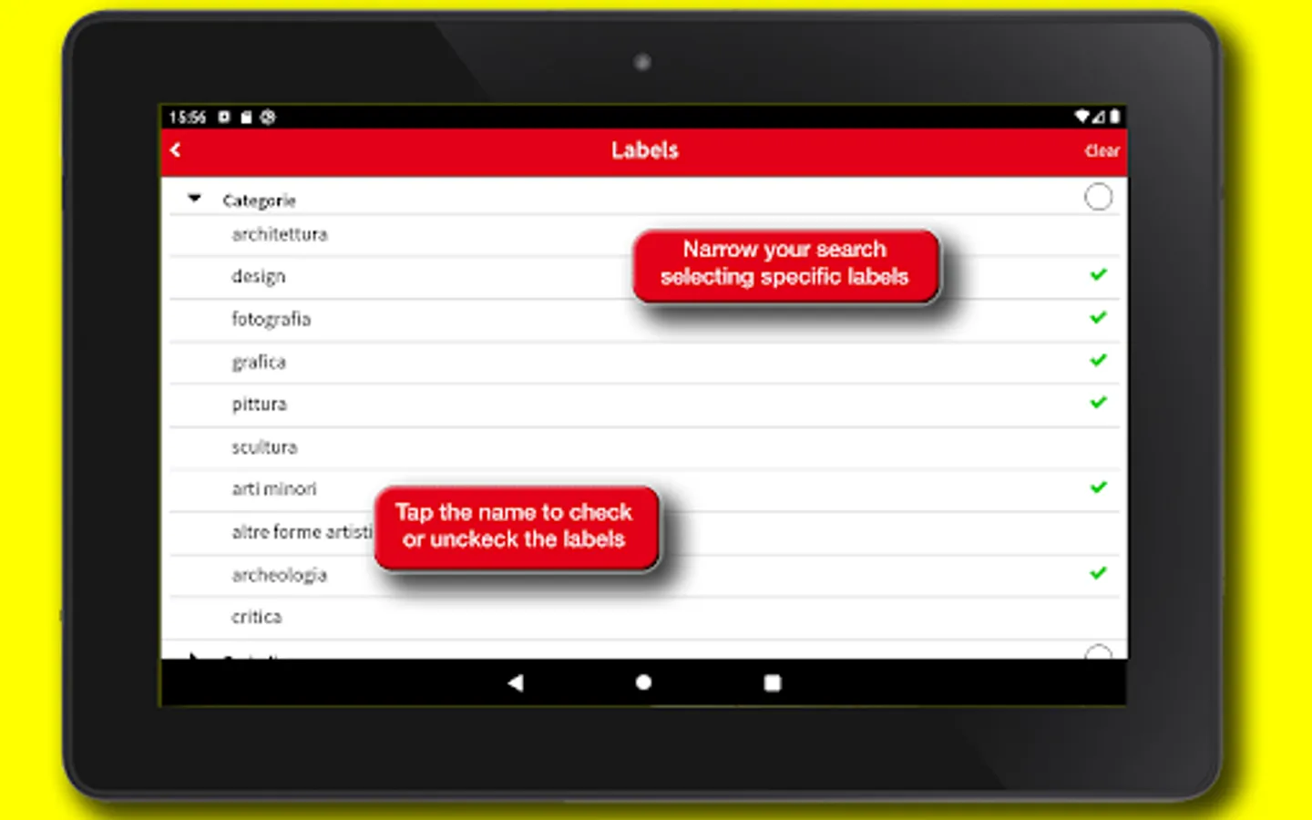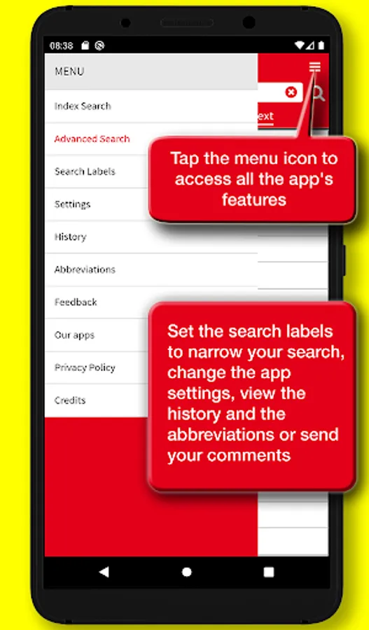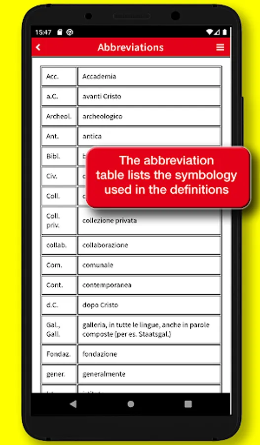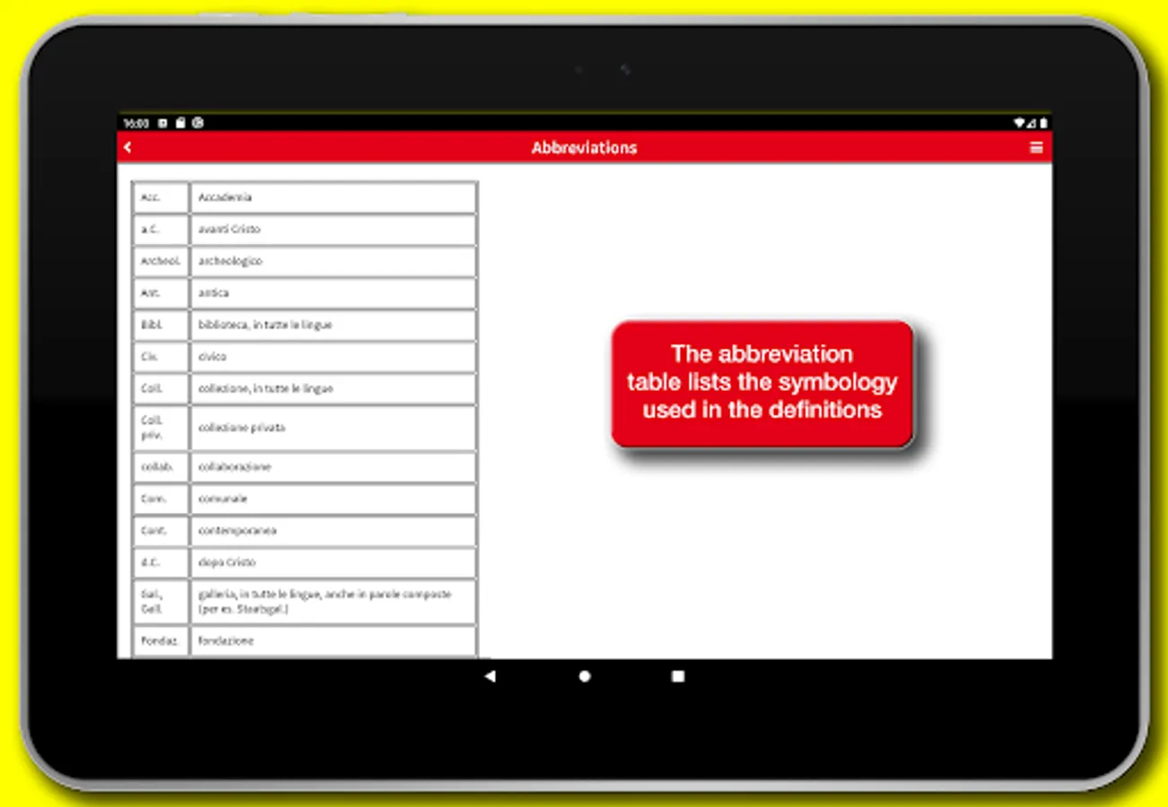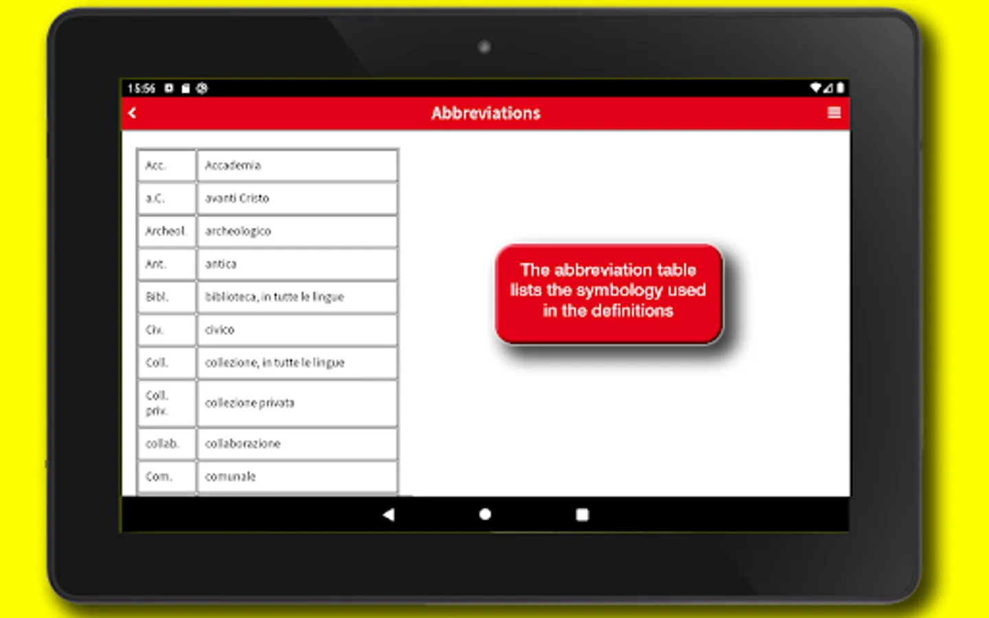 The app's interface has been redesigned to provide a simpler and more intuitive experience. Each definition can be shared using the features available in the device, such as social media, e-mail, SMS, cloud. A main menu that can be activated via an icon available at the top right of the screen enables all the features of the app: