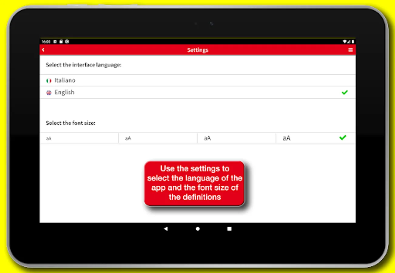 • Settings: allows you to choose the font size of the definitions and the language of the interface