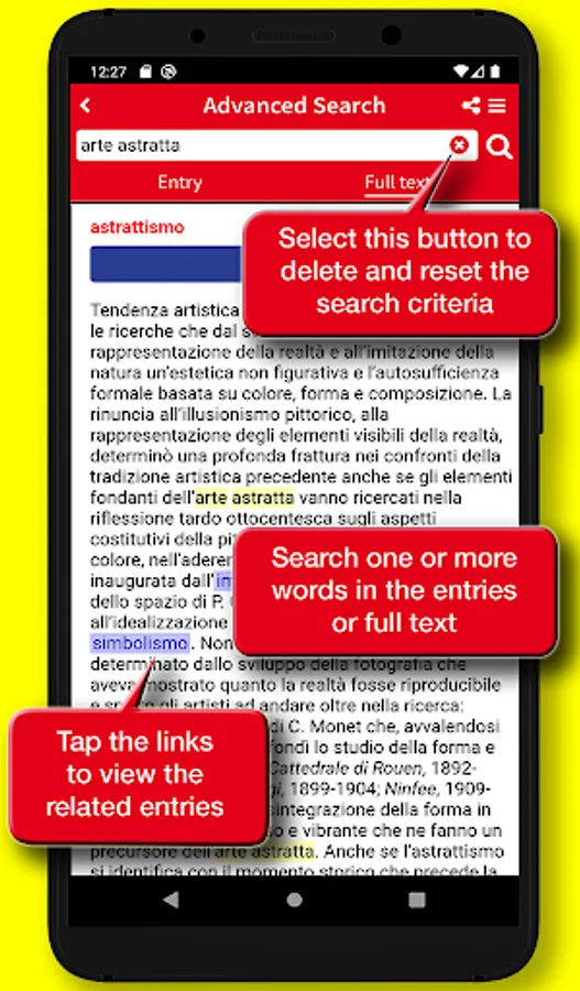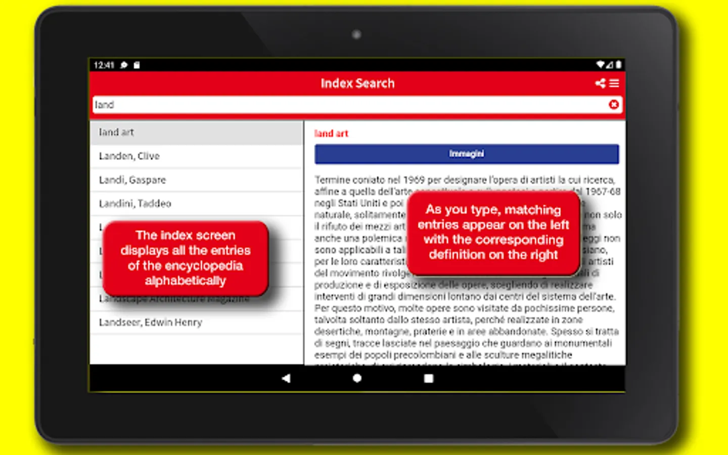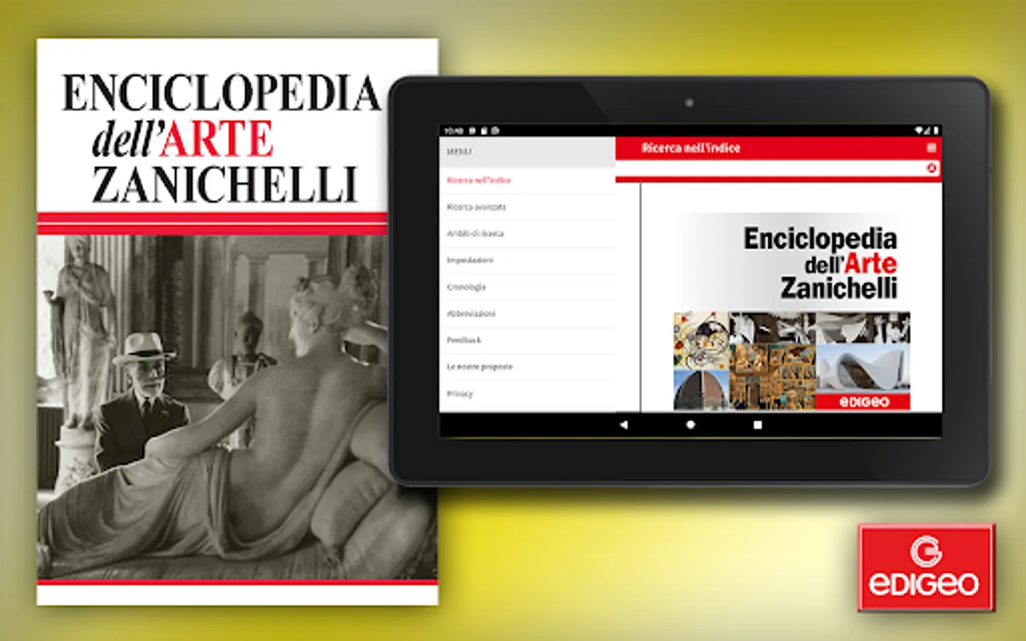 The Enciclopedia dell'Arte Zanichelli drives you throughout figures, movements, genres, and techniques of visual arts and architecture of any age, from cave painting to video art. The list of 10.000 entries includes biographies of painters, sculptors, architects, designers, together with illustrators, photographers, tapestry-weavers, ebonists, and other minor art figures; from universally known figures like Michelangelo, Rembrandt or Picasso, up to the most recent forms of art expression and to young artists from the four corners of the Earth; the headword list includes art collectors, critics, theorists and historians, together with the profiles of the main museums, galleries, and art magazines.