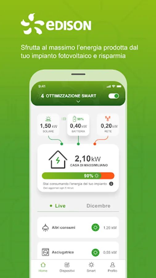 By connecting the smart devices to the Edison My Sun app, you can also access the innovative Smart feature that will allow you to create rules to automatically start the connected devices to always use the energy produced by your photovoltaic system (self-consumption), thus obtaining the maximum economic savings.