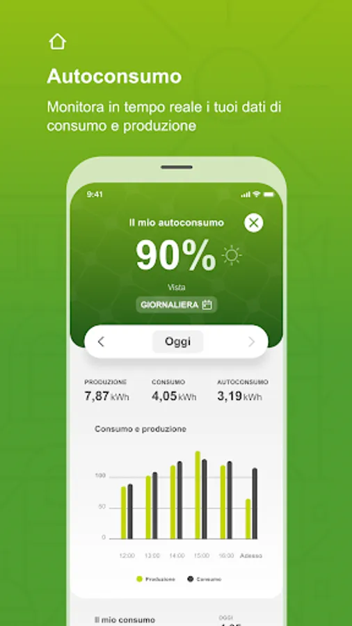 With the Edison My Sun app you can monitor your photovoltaic system in real time. Through simple graphs you can monitor the energy produced by your system, the energy taken from the grid or fed into the grid and the total consumption of your home.