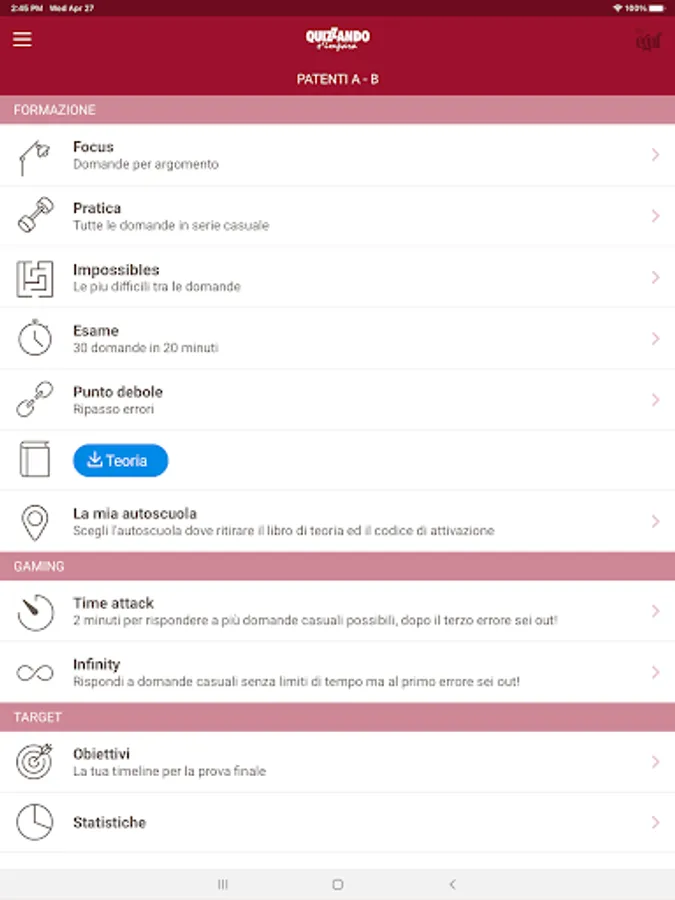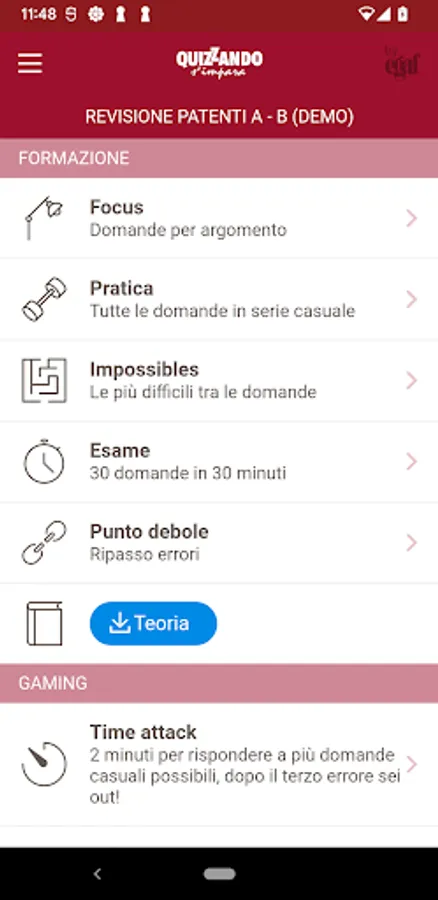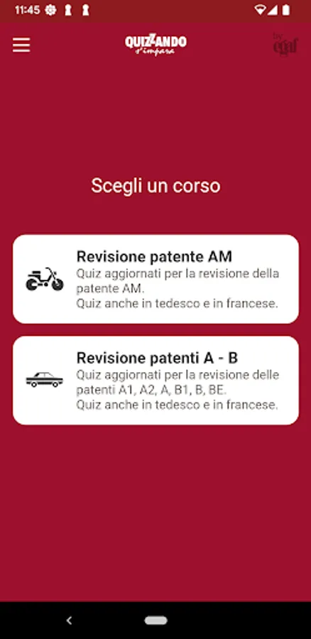 The PRO version, complete with all the updated quizzes + Theory Book, can only be activated by purchasing an activation code. It is the app that allows you to prepare yourself in the best possible way to pass the driving license review exam.