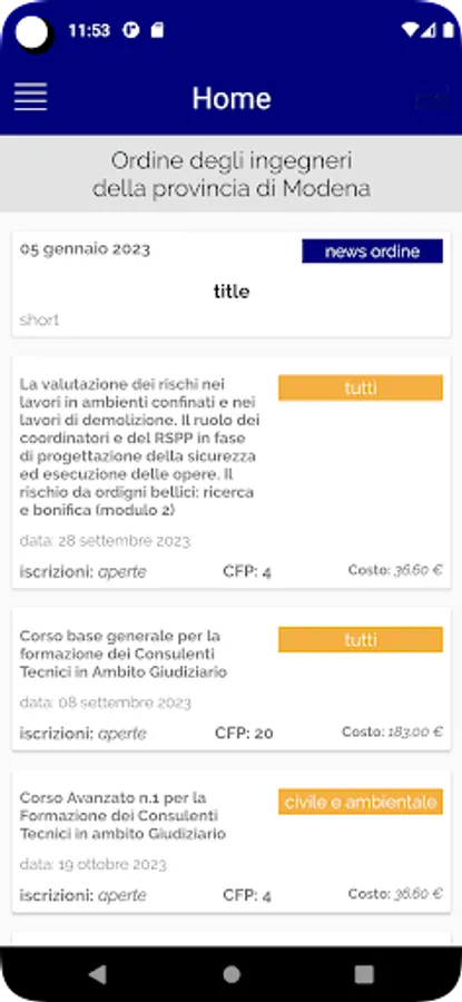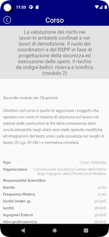 The app is dedicated to members of the Order of Engineers of Modena. It allows you to view the Order's news, consult the calendar of training activities and manage your course registrations. The app can also be used to present the code needed to track attendance at training activities.
