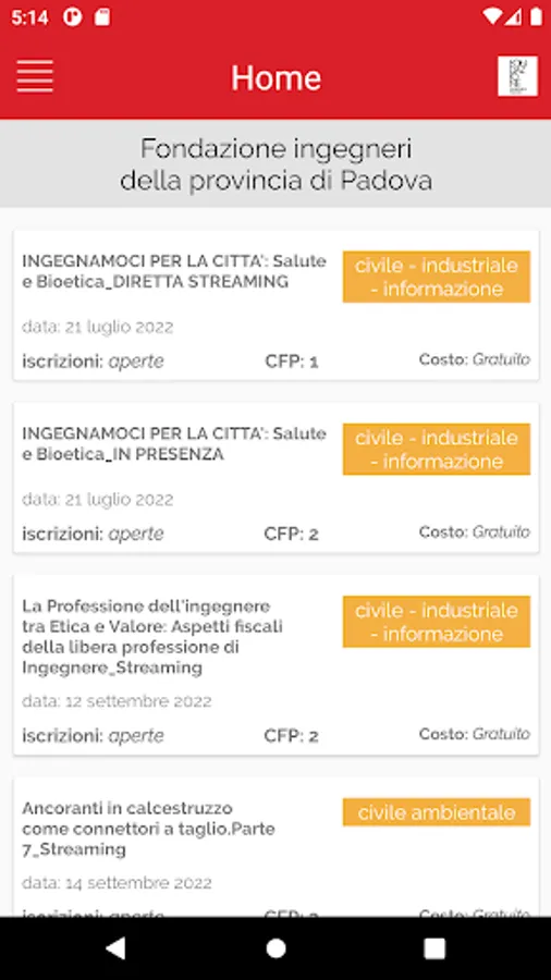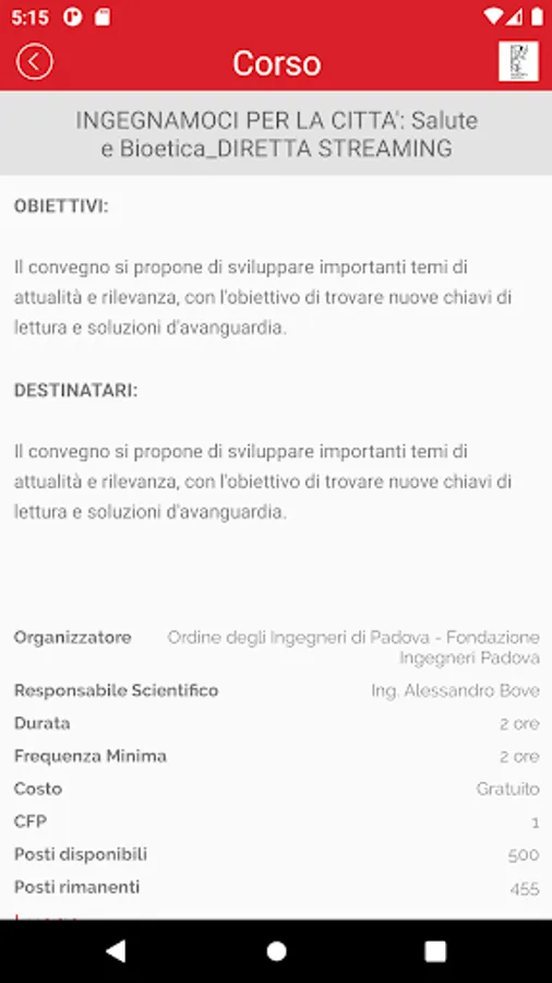 The app is dedicated to members of the Foundation of Engineers of Padua. It allows you to view the news of the Order, consult the calendar of training activities and manage your course registrations. The app can also be used to present the code needed to track attendance at training activities.