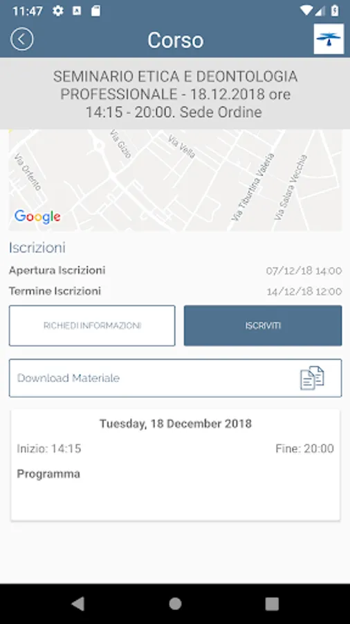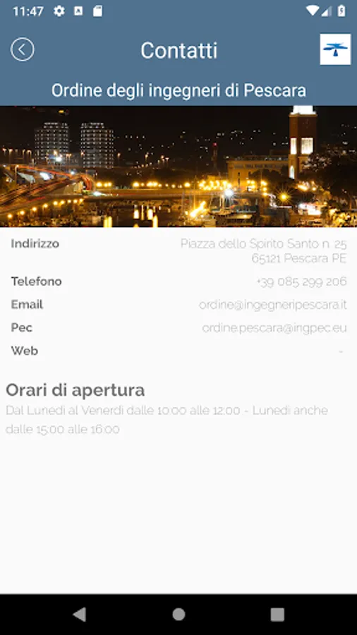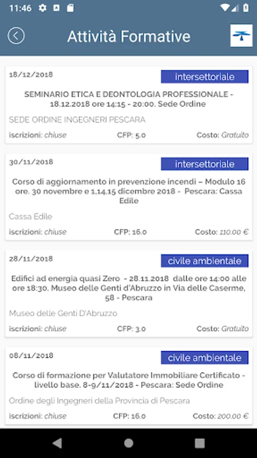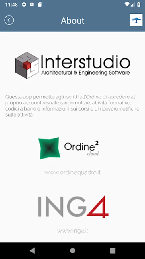 The app is dedicated to members of the Order of Engineers of Pescara. It allows you to view the news of the Order, consult the calendar of training activities and manage your own recordings to the courses. The app can also be used to present the code necessary to record attendance to training activities.