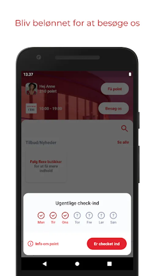 All you have to do to earn points is check in via the app as you make your way past City2. Open the app when you visit our malls and then you are just a few clicks away from earning points. You earn 10 points at each check-in. Max and check-in pr. day.