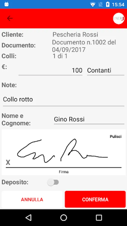 JDelivery of Enerj is the application for the mobile devices for the management of goods delivery with DDT dematerialized, taken over by the carrier, with geolocation delivery signature, anomaly management, photo gallery and possibly damaged packages tick collars. The solution provides for the acquisition of documents to be processed flows from management and, through a web application, the breakdown by carrier / rev deliveries. The carrier takes over the goods and can not print hard copies of its competence. Upon delivery is performed by the customer's signature on the document DDT device to be returned, allowing you to maintain the digital stream. The outcome of delivery is communicated to management through data synchronization. The application is also highly configurable to meet different business needs.