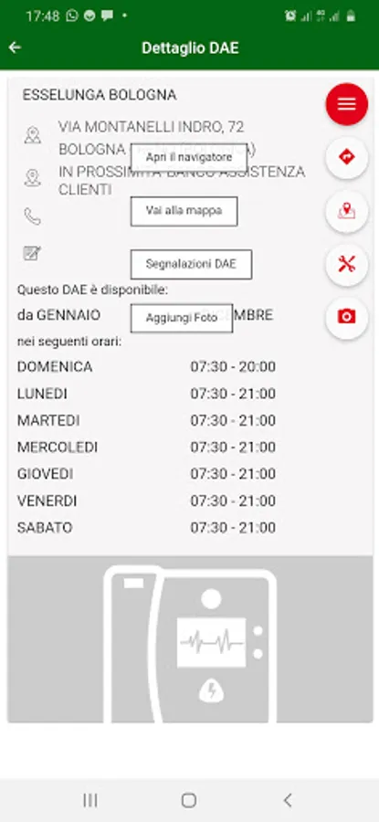 For every AED, in addition to the location, you can define availability (days, times) for more efficient localization in case of emergency, and also manage information concerning deadlines for maintenance, with the future goal of making more effective monitoring the presence of AEDs in the territory.