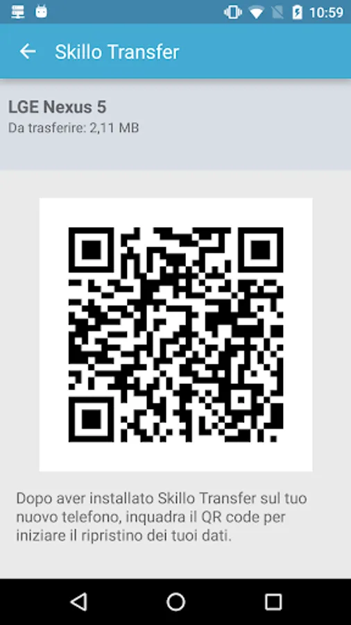 To make a backup just select the data you want to transfer; to perform a recovery of your data instead of just frame the QR code generated from a backup made previously on another device.