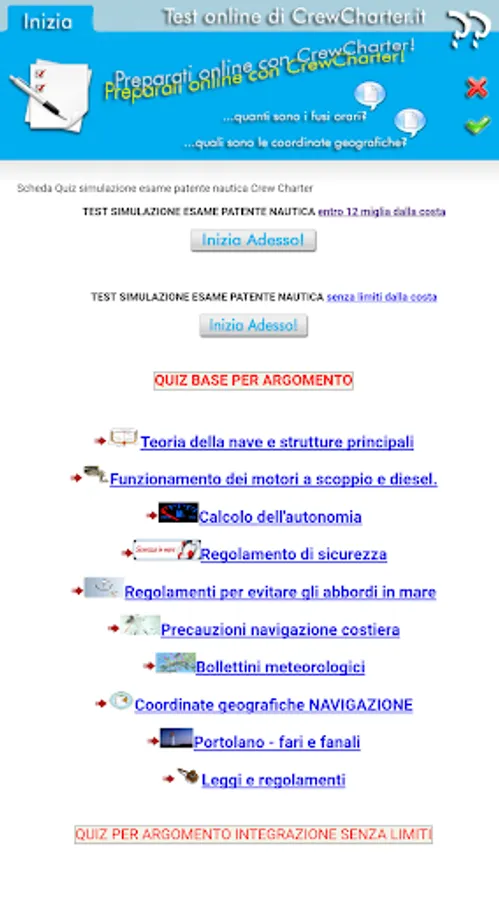 QUIZ BOATING LICENSE EXAM of Crewcharter.it ONLINE allows you to make you gain skills to take the exam for achieving the nautical license within and beyond 12 miles from the coast.