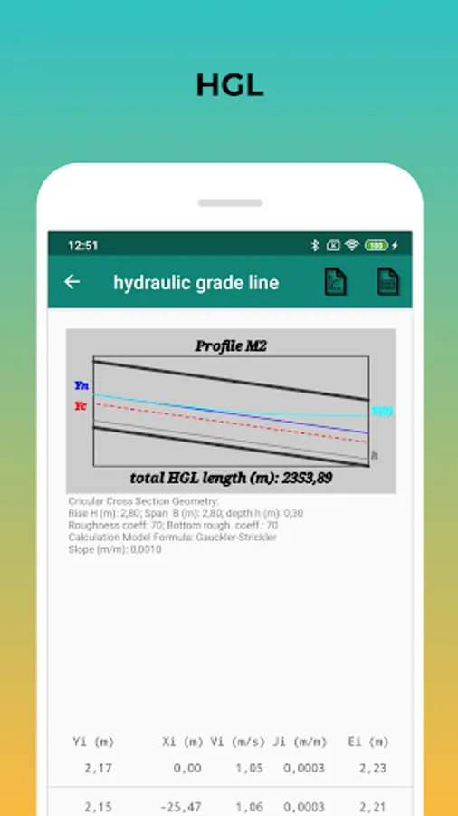 iDrawlix® Mobile Free can represent also the HGL (Hydraulic Grade Line) for a given free surface channel or sewer, which is plotted under hypothesis of gradually varied flow.