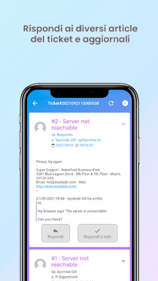 - see the details of the conversation of a ticket, i.e. the list of all articles with sender, recipients, text, attachments, date-time of sending