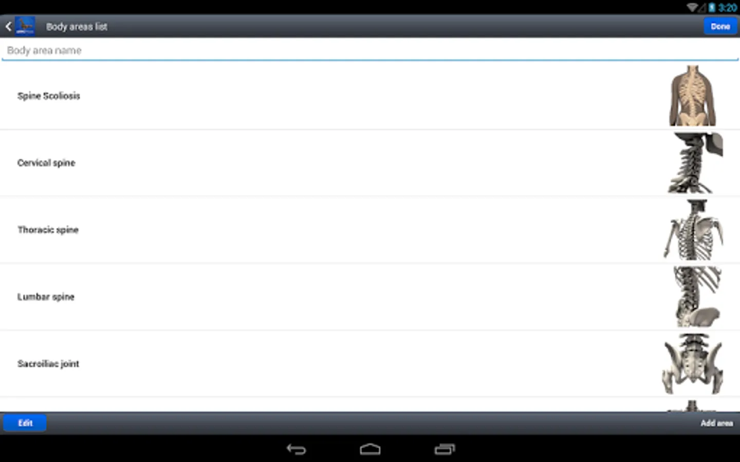 - List of regions of the body with the ability to add, delete parts of the body, change the name of those present, ability to change their display order