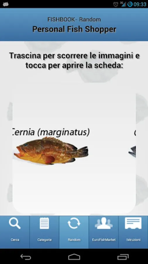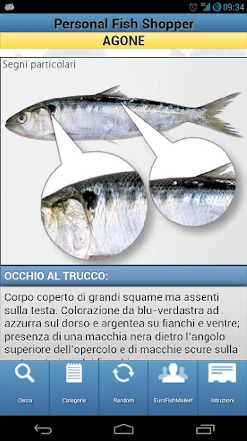 L 'app is divided into categories (fish, molluscs, crustaceans and alternative) by choosing the category displays a list of species which in turn provide access to the data sheet of the species you choose. The cards are made from a photo depicting the details to distinguish the species in question and all information including: