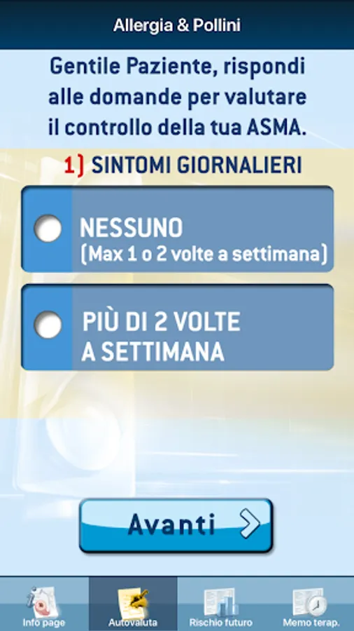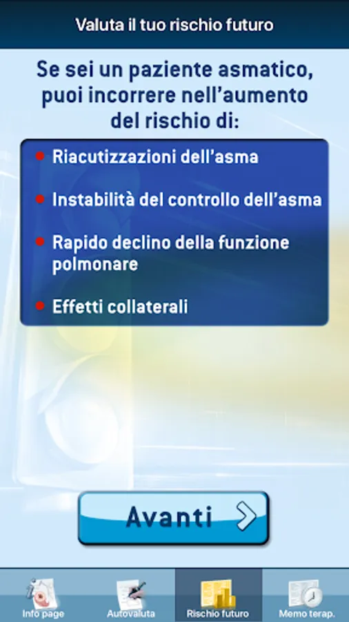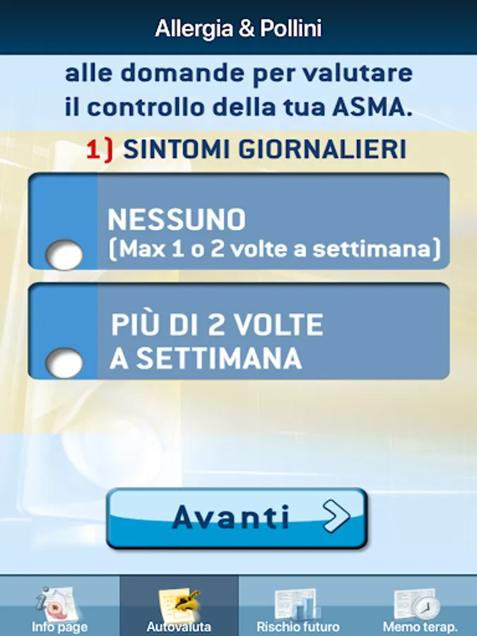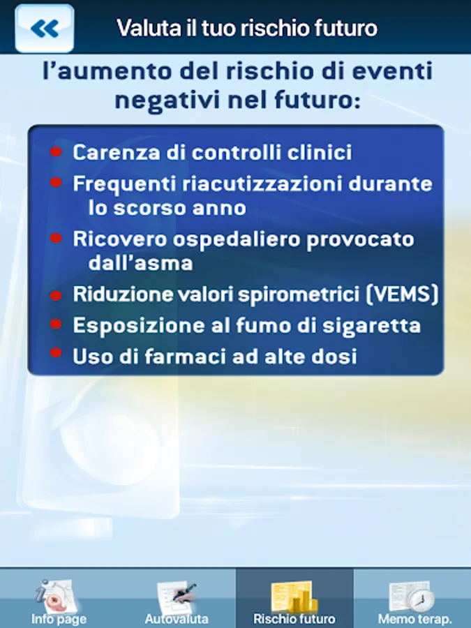 The APP, published under the patronage of LIBRA (Guidelines Italian COPD, rhinitis, asthma) and the presentation of Prof. Paggiaro, is a useful tool to help asthma sufferers to periodically assess the state of their disease. The APP contains a simple method of self-assessment, by the answer to a few questions, you can get a result on the adequacy of control ell'asma. The test result is expressed visually with a "color code" that refers to the familiar image of the traffic light (green = controlled asthma; yellow = partly controlled asthma; red = uncontrolled asthma). The patient who falls in the "yellow or red" may usefully consult your doctor to share the level of control of 'Asthma and reassess the prescribed therapy. The APP also contains two useful functions, a daily intake of memory therapy (setting time and "trill") and another to remember, every 4 weeks, the need to redo the text self-assessment.