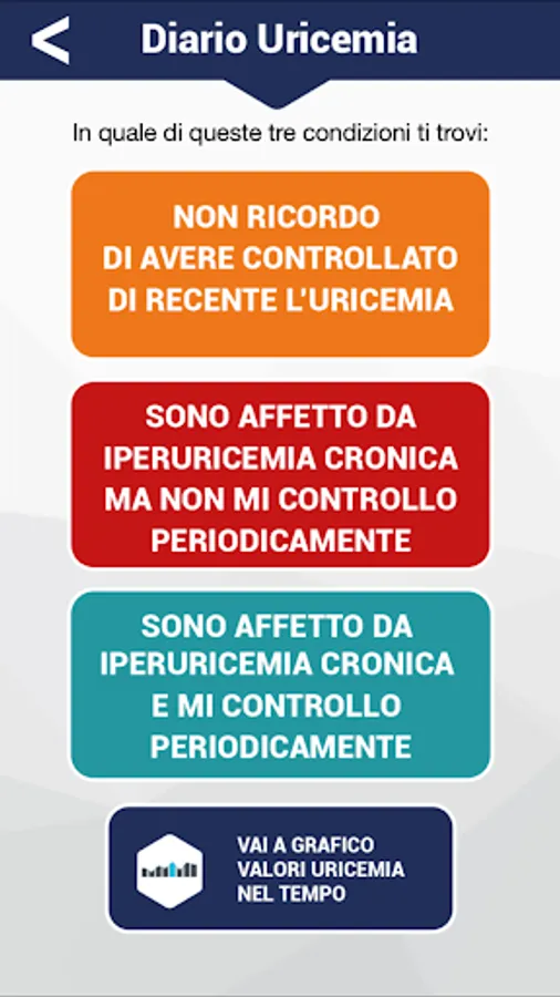 Once you downloaded the APP will be able to self-evaluate the patient's risk of being affected by hyperuricemia, with a test consisting of a few simple questions, and you will also be able to have a useful diary of urea measurements and any current therapies.