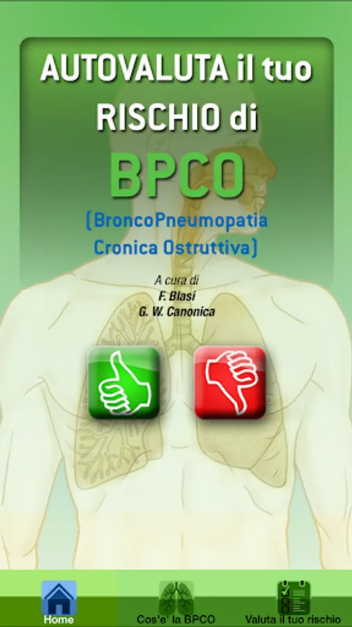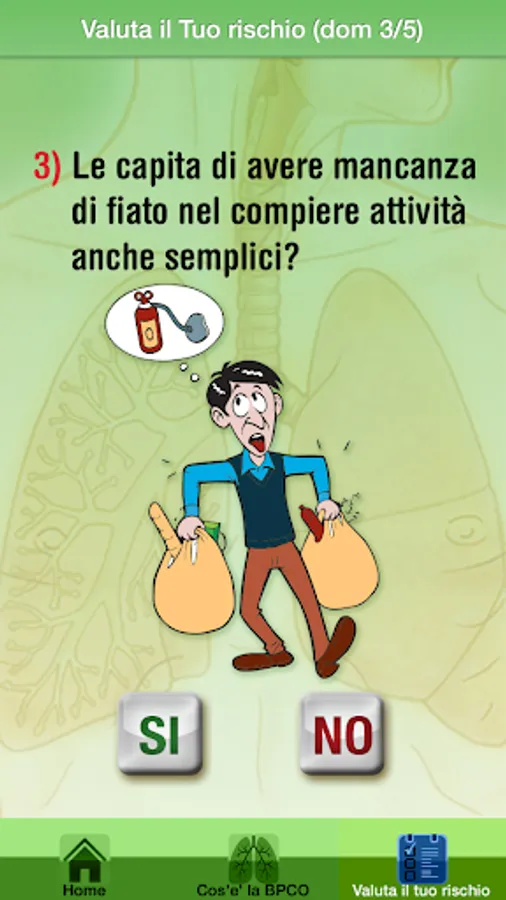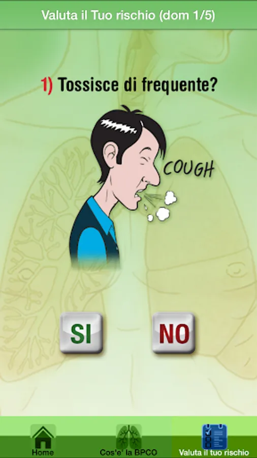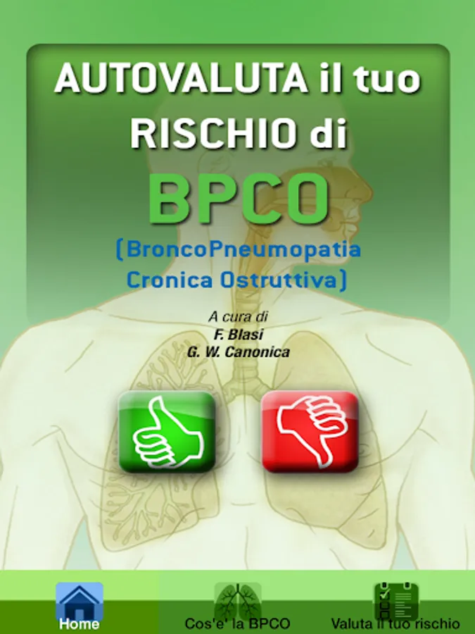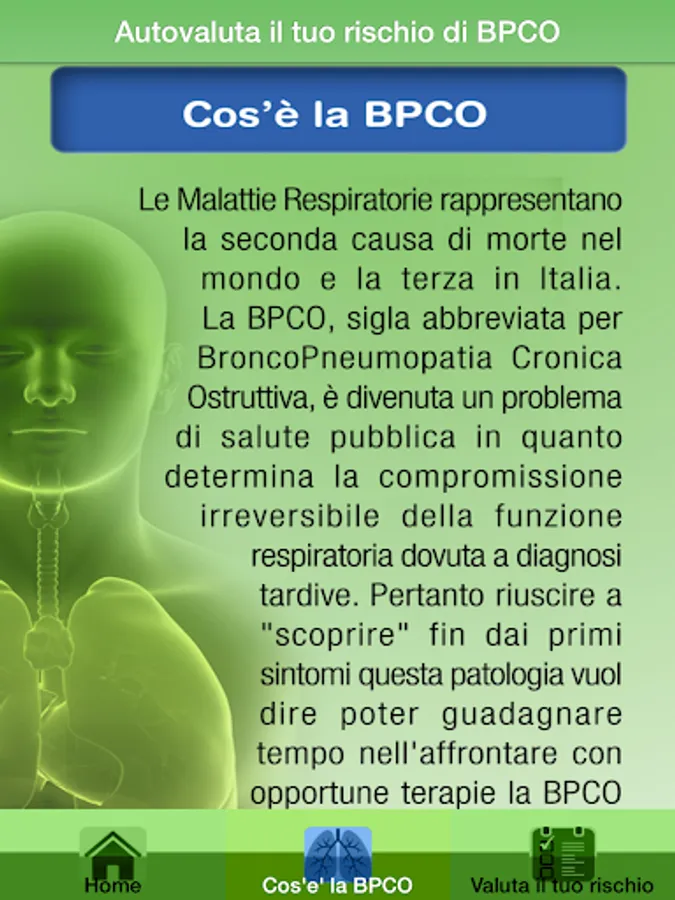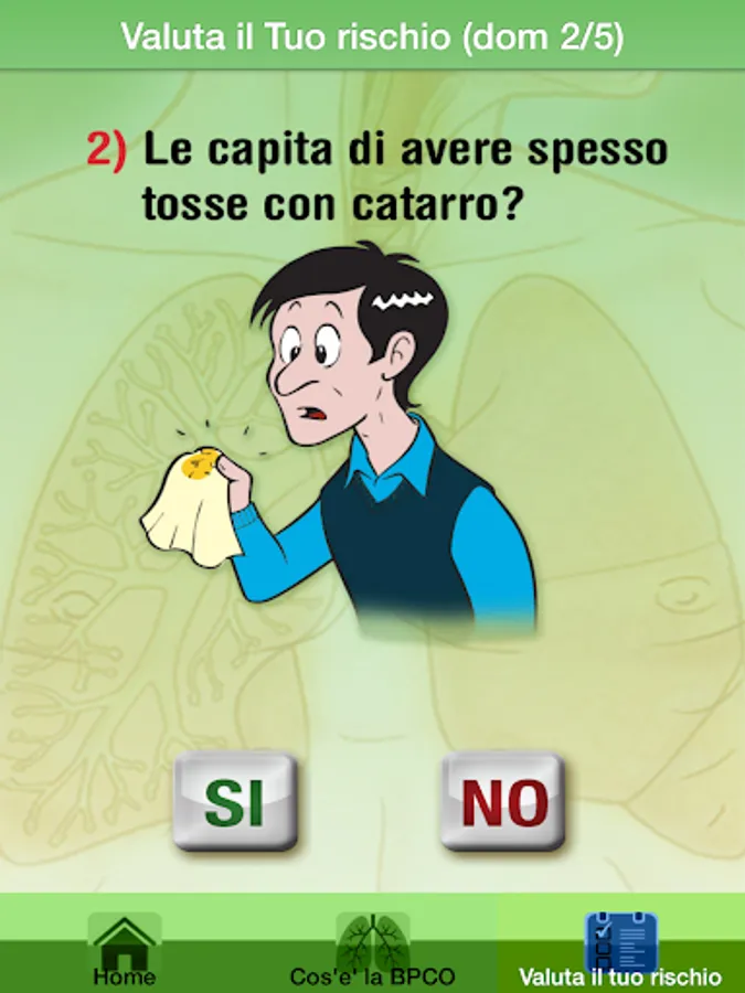 The APP "Autovaluta your risk of COPD" allows, by answering a few simple questions (formulated on the basis of current scientific documents) to carry out a self-assessment of their risk of COPD.