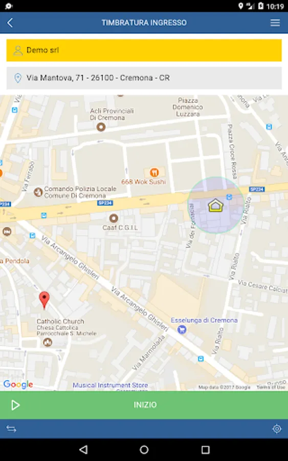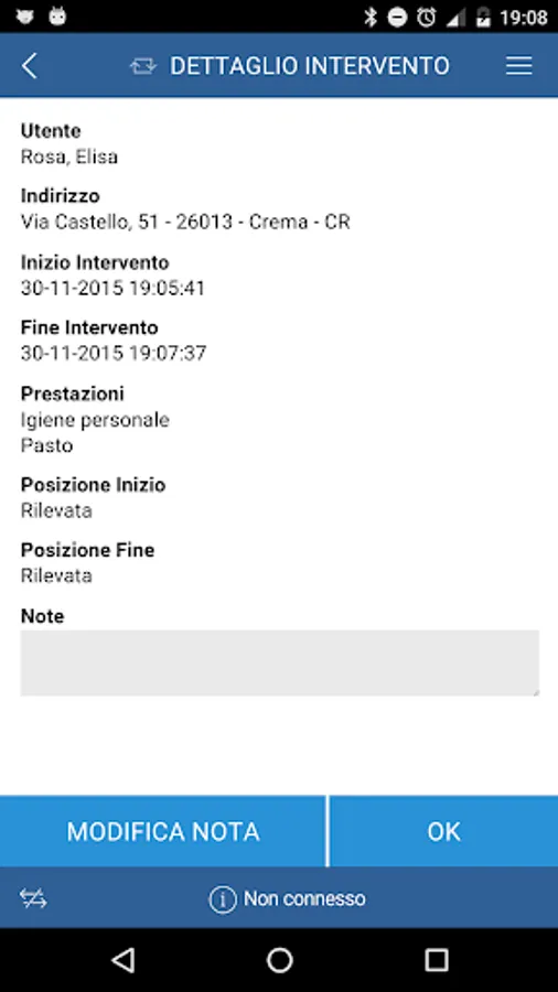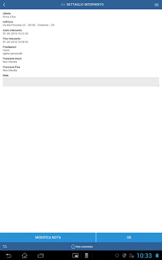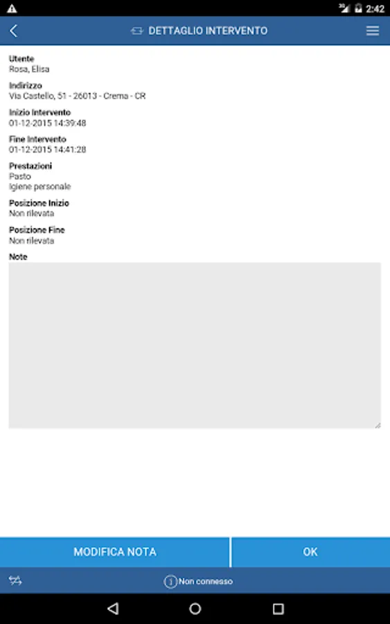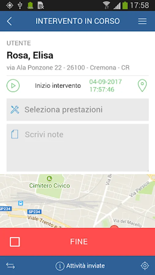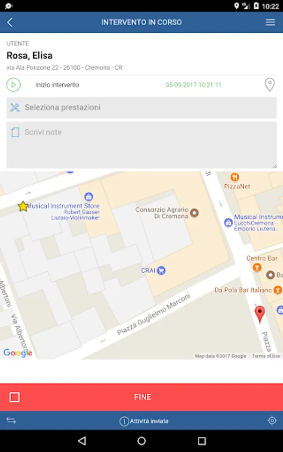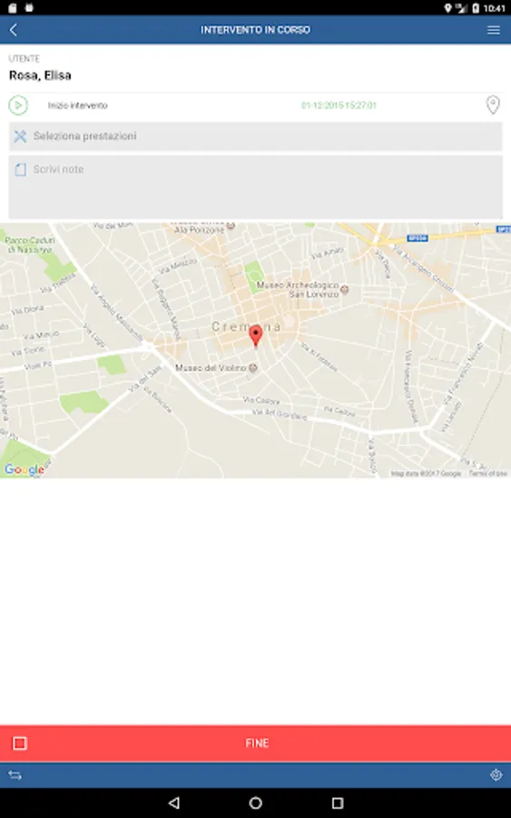 The app allows the recording (geo-referenced) the date and time of start / end operations work of the staff in the territory; also collects information on the type of service provided and transmits real-time operator of the system. Also allows reporting of transfers and lunch breaks. A simple and complete web interface allows the management of all master data, the services provided and provides a comprehensive set of reports.