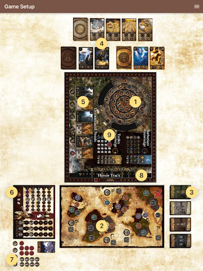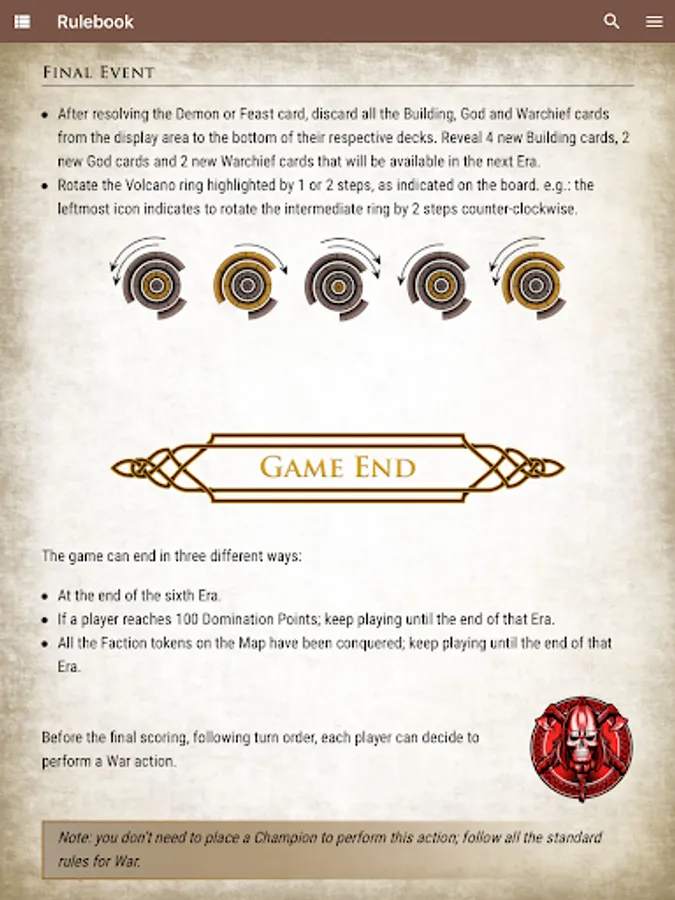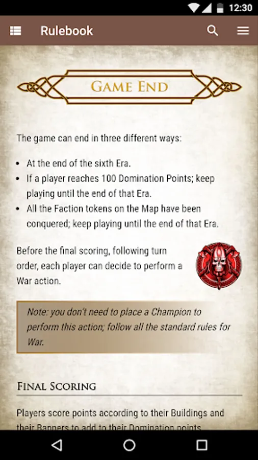With the digitalized Rulebook you can look up any term or keyword you may be interested in, to quickly disperse any doubt during your play without having to reach out for the paper manual and slowing down the game.