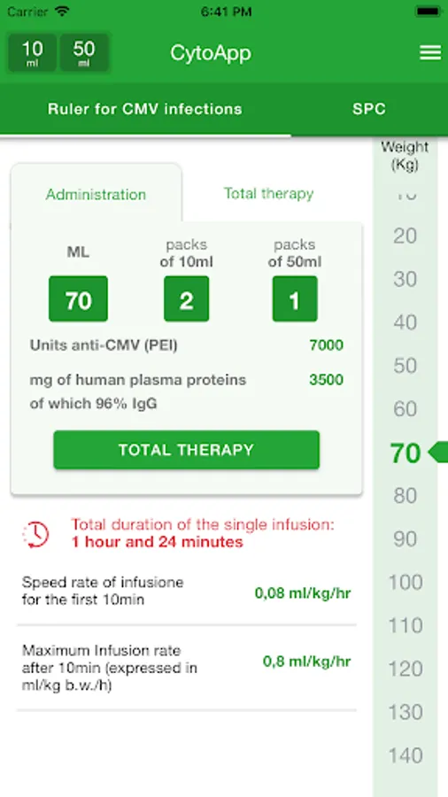 CytoApp is designed as a digital training device for the medical community for the immediate calibration of Cytomegatect ® dosages: a digital ruler that supports the doctor’s professional activity in the treatment of CMV infections in patients who are on immunosuppressive therapy and especially in those who have been transplanted. Featuring a simple interface and very practical graphic controls, CytoApp has an algorithm that instantaneously calculates the personalised dosage of Cytomegatect® based on the patient’s body weight, indicating the precise daily quantity of ml/mg to be administered, the packs to be used, and the infusion rate.