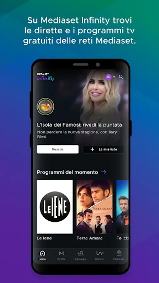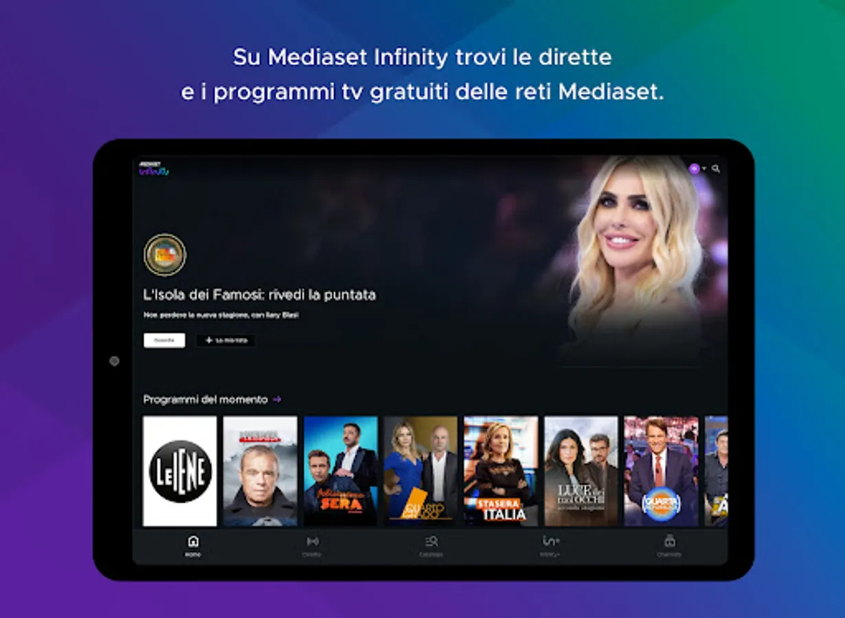 – The best known shows of the Mediaset networks on demand: Le Iene, Big Brother Vip, L'Isola dei Famosi, C'è Posta per Te, Amici, Men and Women, Striscia la Notizia, Verissimo and Avanti un Altro