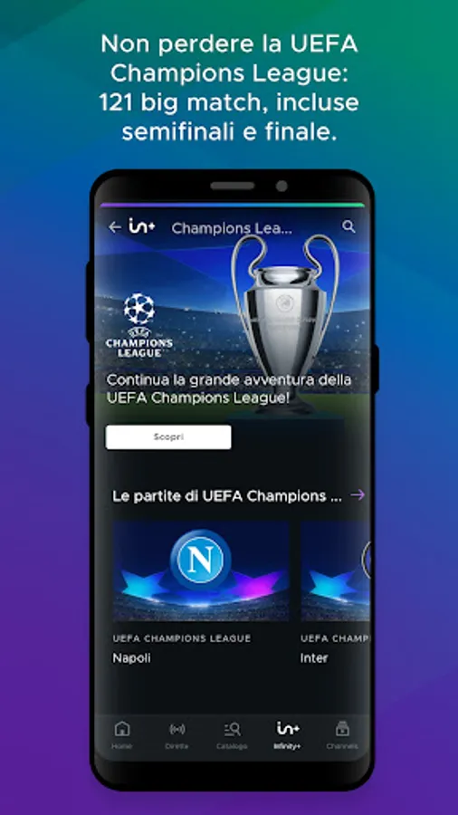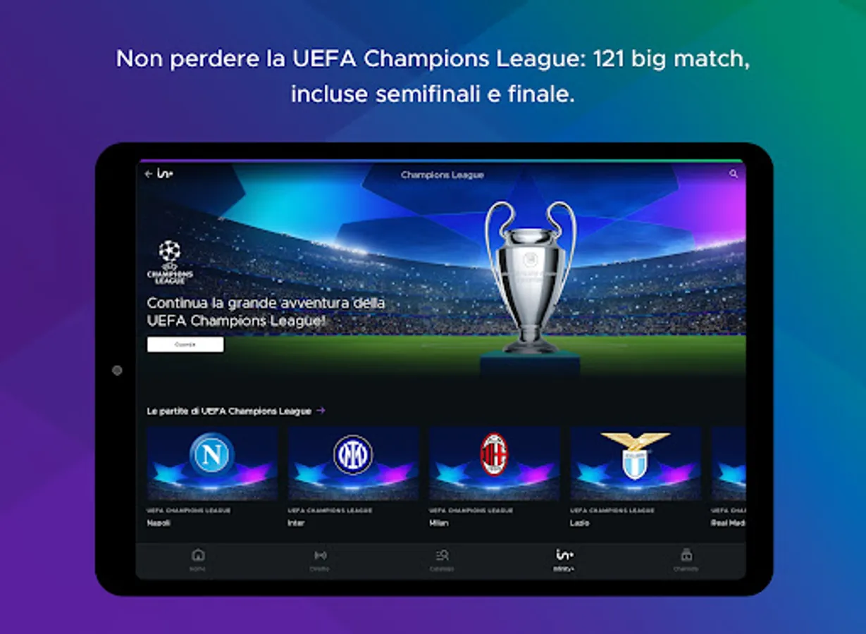 – The UEFA Champions League: the free match on Tuesday and, with Infinity+, all other matches on Tuesday and 7 of the 8 Wednesday matches in the group stage. 121 big matches, including semifinals and final. But that's not all: all the Coppa Italia matches exclusively and the highlights of the Serie A matches