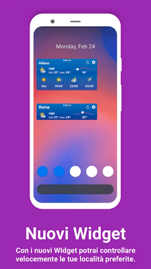 With horizontal scrolling, you can consult all the locations you have chosen or added to your favorites, for example: your city, your workplace, a seaside or mountain location.