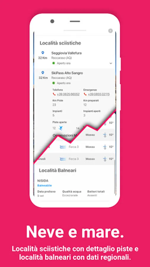 It also provides details on the ski resorts and their facilities (number of slopes, type, open slopes), detailed information for the seaside resorts (water analysis, bathing bans) and real-time observations from the main Italian airports.