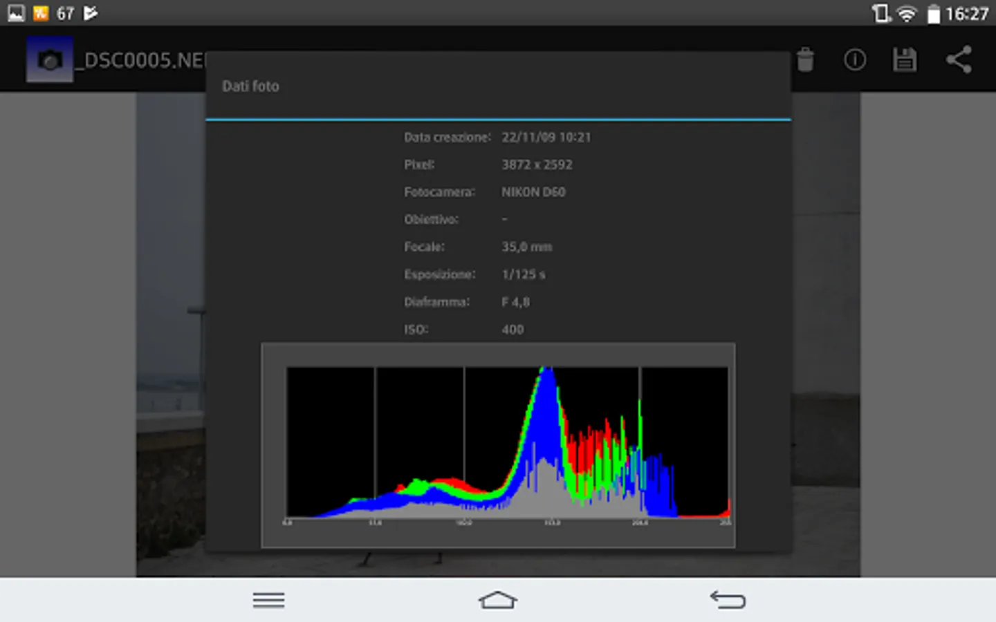 In the photo information Exif data and histogram are displayed.