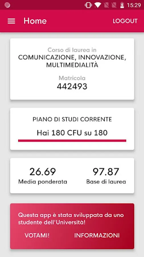 - Home: Shows the matriculation number, the accumulated CFU, the total credits in the approved study plan, the grade average and the degree base.