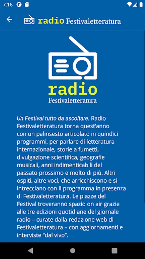 A Festival to be listened to. Radio Festivaletteratura returns this year with a schedule divided into fifteen programs, to talk about international literature, comic stories, scientific dissemination, musical geographies, unforgettable years of the near past and much more. Other guests, other voices, which enrich and intertwine with the program in the presence of Festivaletteratura. The squares of the Festival will find space on air thanks to the three daily editions of the radio newspaper - edited by the web editorial staff of Festivaletteratura - with updates and “live” interviews.
