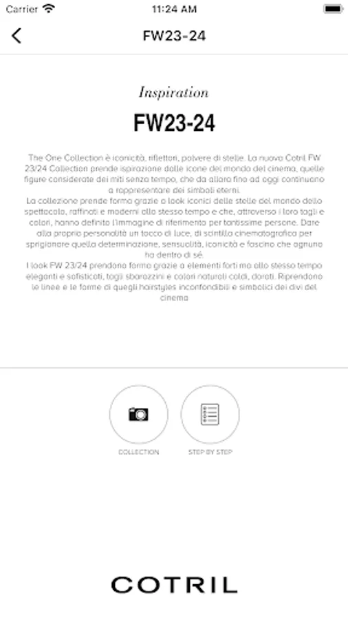 Inside the app you'll find a gallery with all the photos of the latest man/woman collections, tutorials and backstage videos. A journey inside Cotril world.